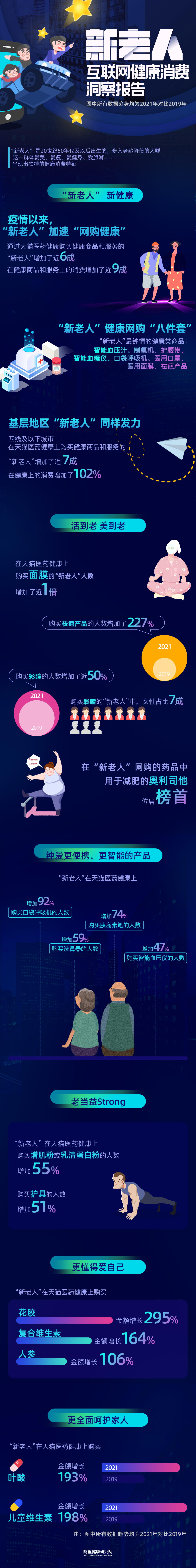 阿里健康研究院发布《新老人互联网健康消费洞察报告》显示,相较于2019年,2021年通过天猫医药健康购买健康商品和服务的“新老人”增加了近6成,相应的消费金额增加了近9成。
