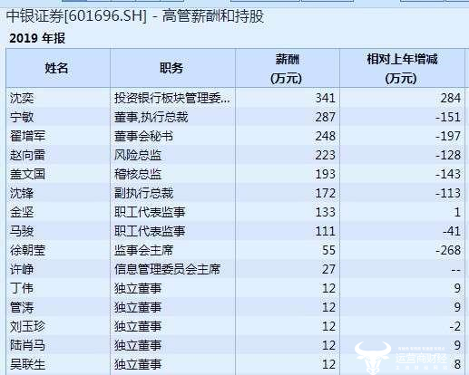 根据中银国际历年的报告,宁敏从公司获得的税前报酬总额宁敏2018年为437万,2019年减少至287万,而2020年为297.26万元,2020年监事会主席徐朝莹从公司获得的税前报酬总额55.02万元,比前几年少了很多。董事会秘书翟增军从公司获得的税前报酬总额234.39万元。