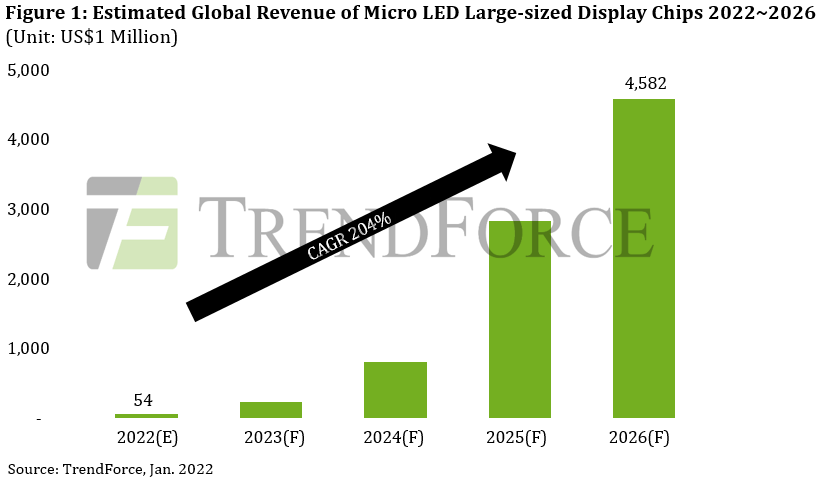 TrendForce最新研究显示,微型LED大尺寸显示器将走向家庭影院和高端商用显示市场,预计2022年微型LED大尺寸显示芯片收入将达到5400万美元。到2026年,收入预计将增长到45亿美元,年复合增长率为 204%。