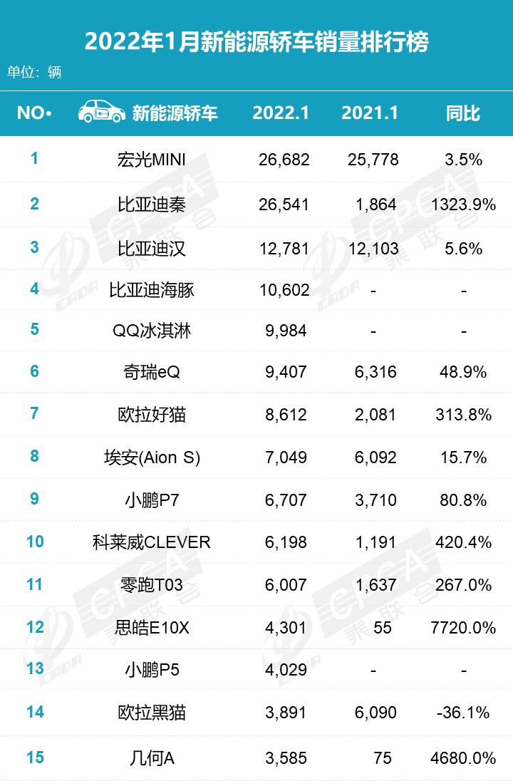 近日,乘联会公布了2022年1月份新能源轿车销量排行榜(前十五),其中五菱宏光MINI EV依旧能打,以26682台的成绩,勇夺冠军!第二到第四被比亚迪“包圆”,秦、汉和海豚分别取得了26541台、12781台和10602台的好成绩,其中秦同比去年1月份的销量暴涨1323.9%,表现着实惊艳。