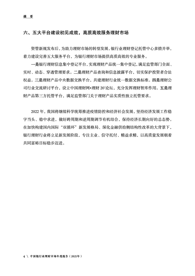 《报告》指出,2022年,我国将继续科学统筹推进疫情防控和经济社会发展,坚持经济发展工作稳字当头、稳中求进,做好跨周期和逆周期调节有机结合,保持经济长期向好的总态势。尽管外部环境存在诸多不确定性,但国内经济仍将展现出强劲韧性与巨大潜力。在加快构建国内国际双循环新发展格局、深化金融供给侧结构性改革的大背景下,银行理财行业步入提质升级的新阶段。