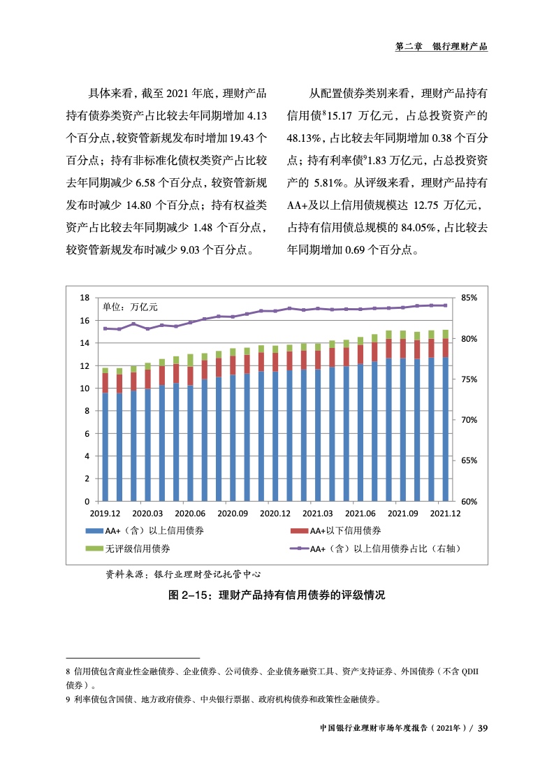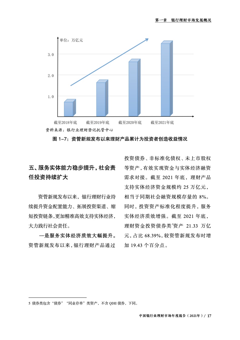 五是服务实体能力稳步提升,社会责任投资持续扩大。银行理财行业持续提升资金配置能力、拓展投资渠道、缩短投资链条,更加精准高效支持实体经济,大力践行社会责任。截至2021年底,银行理财产品通过投资债券、非标准化债权、未上市股权等资产,支持实体经济资金规模约25万亿元,约占同期社会融资规模存量的8%。