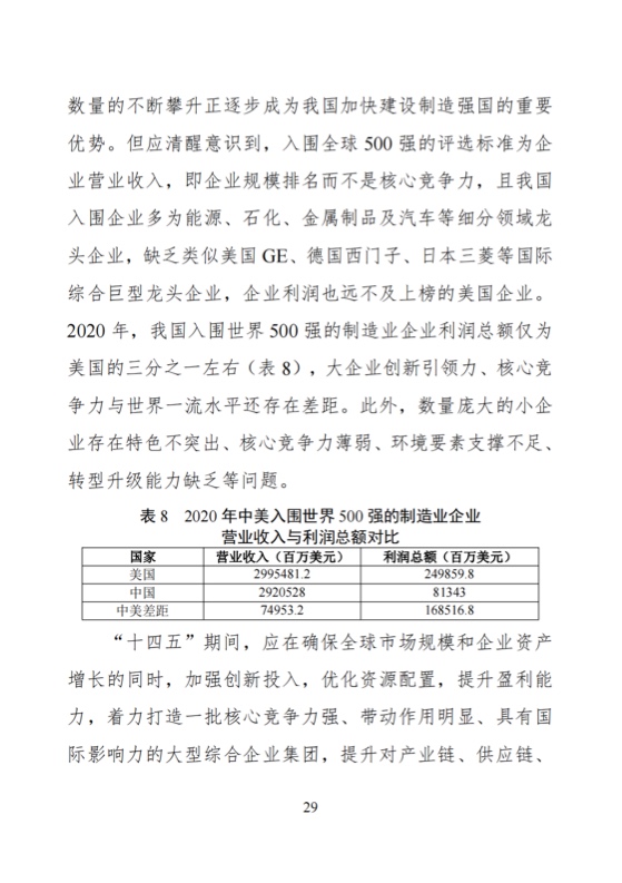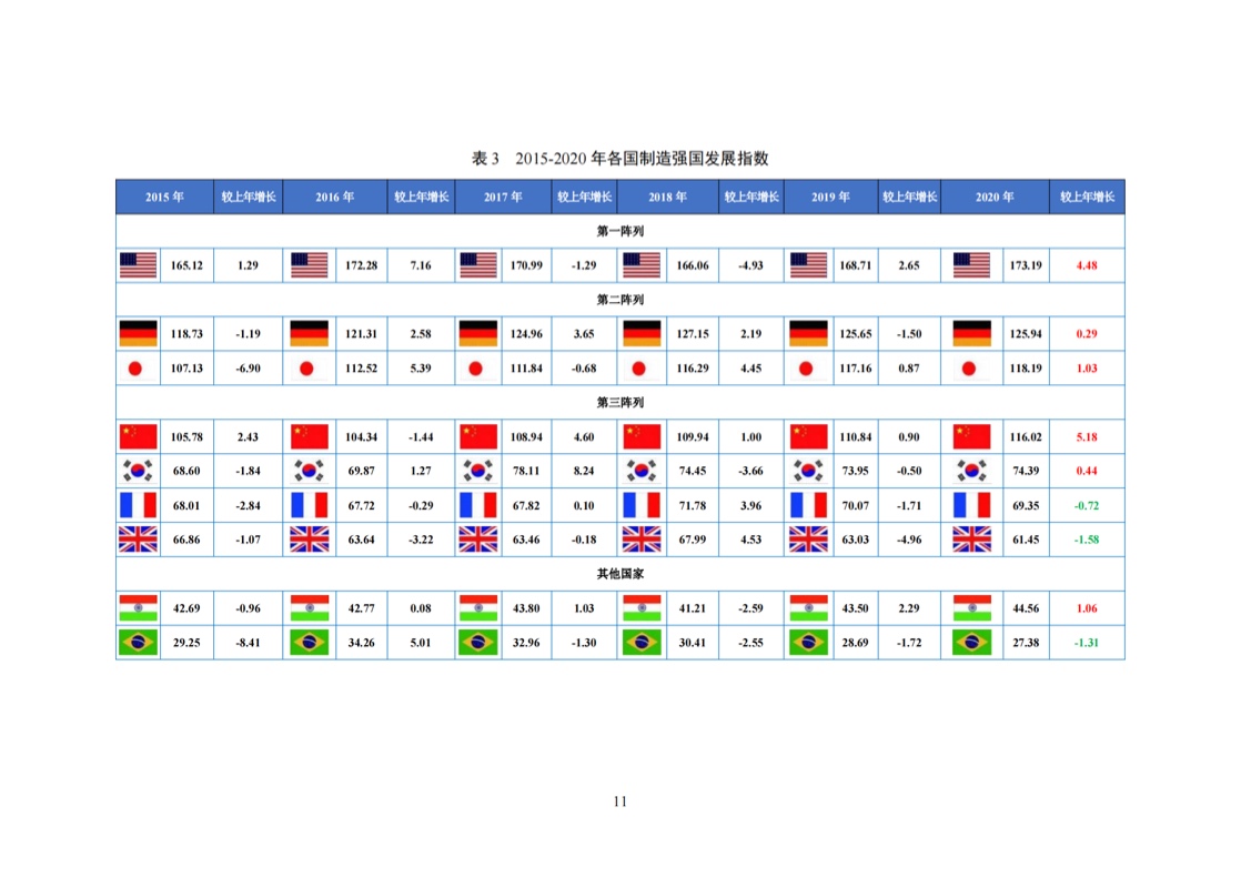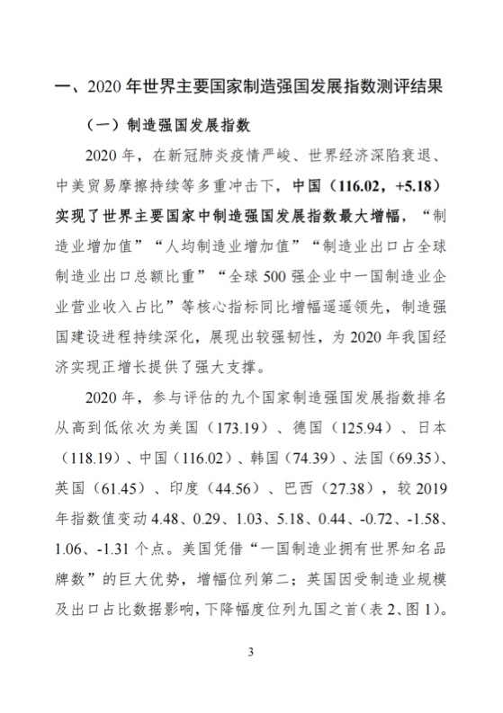 《报告》显示,2020年,面对错综复杂的国际环境和艰巨繁重的国内改革发展稳定任务,特别是在新冠肺炎疫情及中美贸易争端的严重冲击下,中国制造业经受住了巨大考验,在中国、美国、德国、日本、英国、法国、韩国、巴西、印度九国对比中,充分彰显了体系完整优势:规模优势唯一增长,质量效益基本稳定,创新动能活力提升,强基固本初见成效,绿色低碳践行有力。我国与第一、二阵列国家制造强国发展指数差距不断缩小,追赶步伐持续加快。
