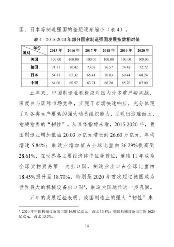 《报告》总结了我国2015-2020年制造强国建设进程及经验。五年间,中国制造强国发展指数由105.78增长到116.02。我国制造业总体趋势稳中向好,实现了市场快速响应,体现出对各类生产要素的强大动员组织能力,呈现出迎难而上、愈战愈勇的“韧性”。