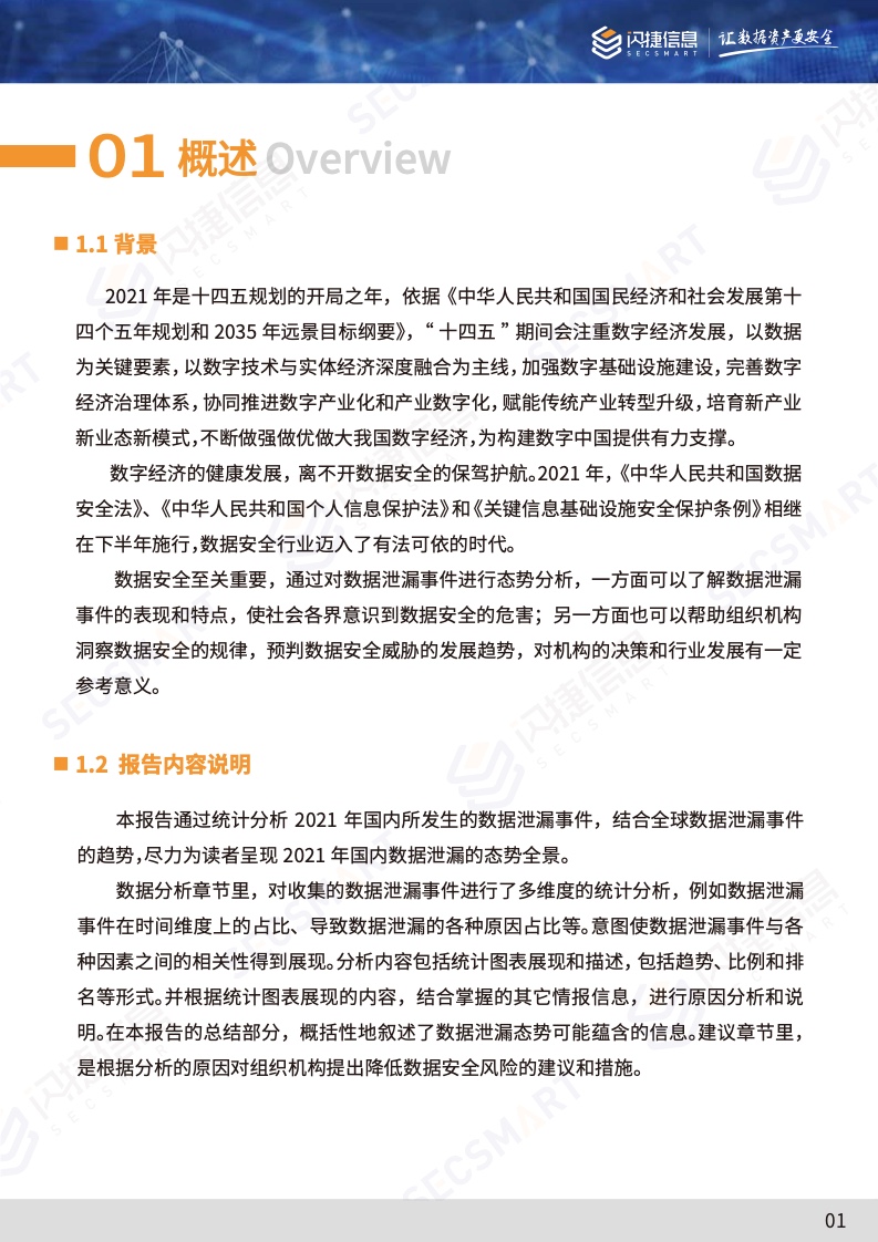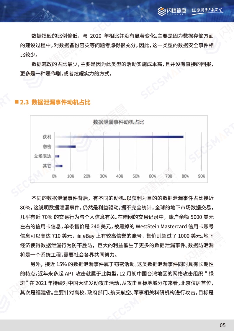 《报告》通过统计分析2021年国内所发生的数据泄漏事件,结合全球数据泄漏事件的趋势,从数据泄漏事件、时间、人员、动机、数据源以及个人信息泄漏态势进行总结分析,多维度呈现2021年国内数据泄漏的态势全景,并提供2022年数据泄漏的研判预测。