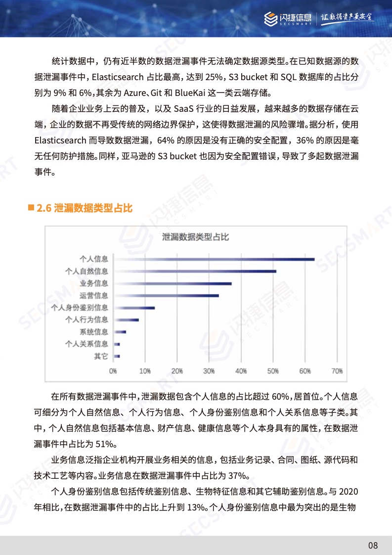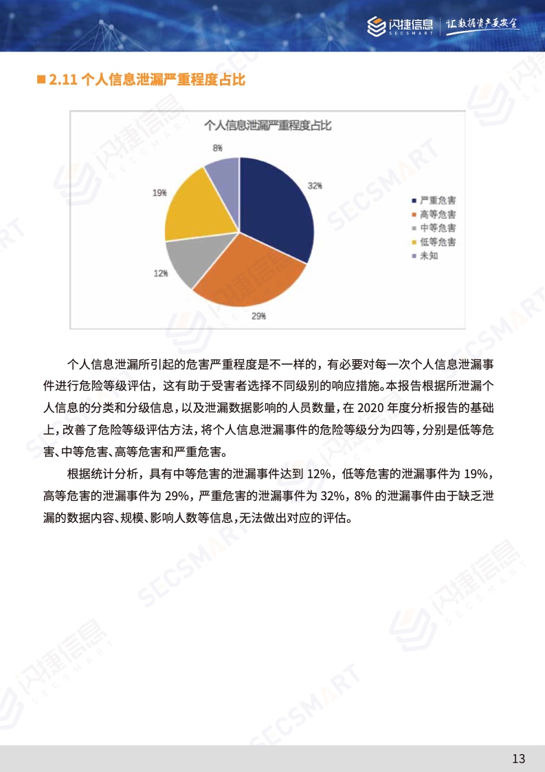 回顾2021年发生的多起数据泄漏事件,不论是从数据泄漏的规模、数量、影响程度,都呈现扩张的趋势,数据泄漏场景愈加复杂多变,闪捷信息安全与战略研究中心建议,组织机构应密切关注数据安全局势,不断排查数据安全隐患,做好整体数据安全规划,防患于未然。