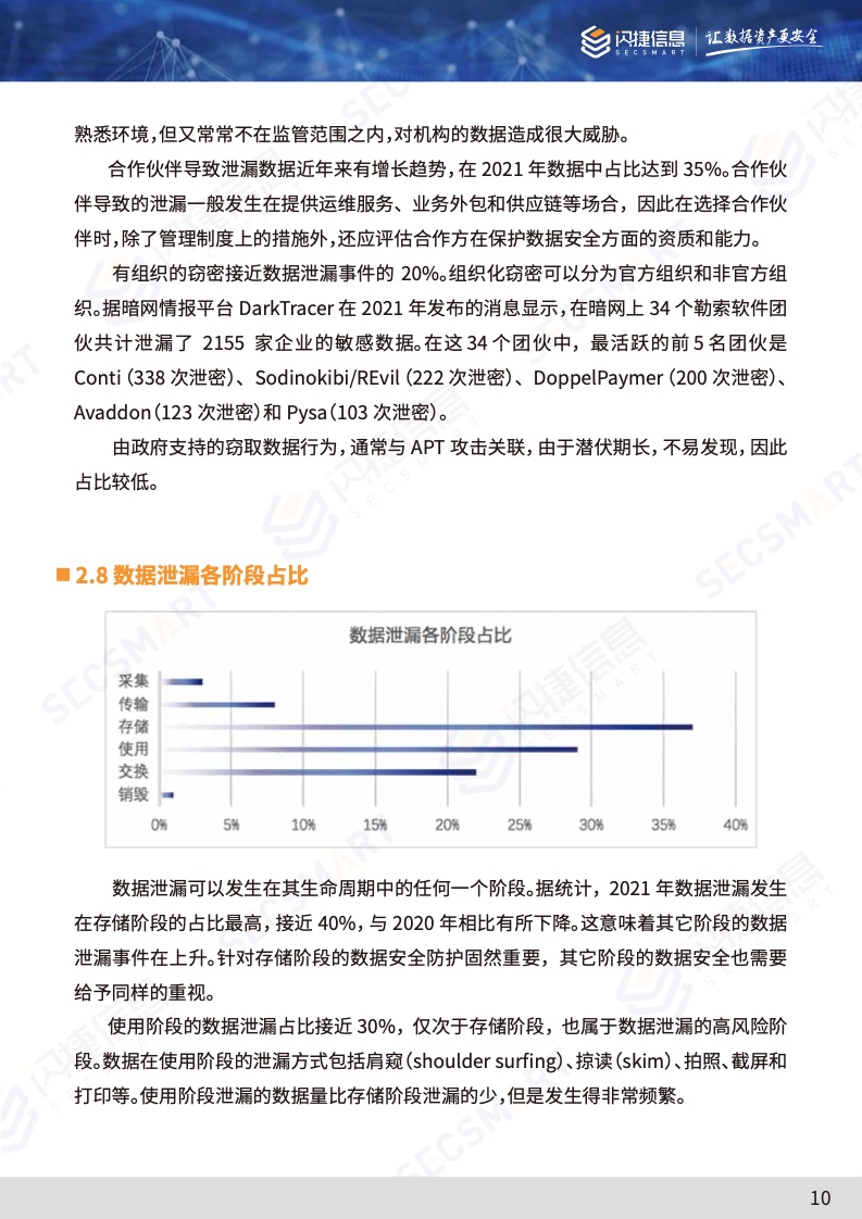 从数据的全生命周期阶段分析数据泄漏发现,2021年数据泄漏发生在存储阶段的占比最高,接近40%,其次是数据使用阶段,占比接近30%,都属于数据泄漏的高风险阶段和数据安全防御的重点阶段,应给予重视。