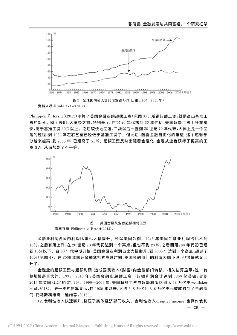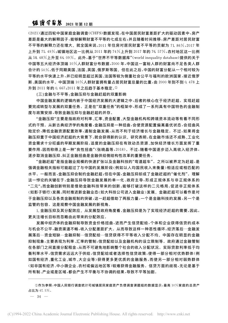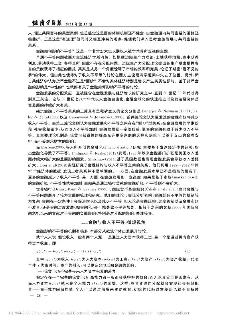 世界银行 (Demirg-Kunt & Levine, 2009)与国际货币基金组织也对金融与不平等问题展开了较为全面的梳理和研究。他们的理论与实证分析表明:金融影响不平等的机制较为复杂;金融在一定条件下会促进增长以及减少不平等,但无论是金融压抑(过度管制以及金融市场不发育)还是金融过度发展(如金融化)都可能导致不平等加剧。相较于之前的文献,2008年国际金融危机以来的文献对于金融的负面影响(特别是对分配的影响)关注较多。