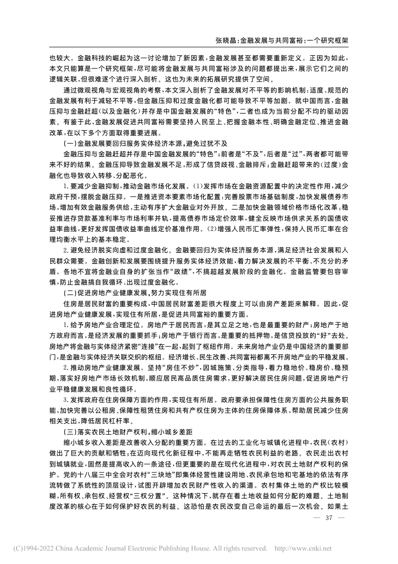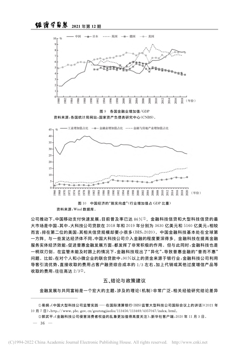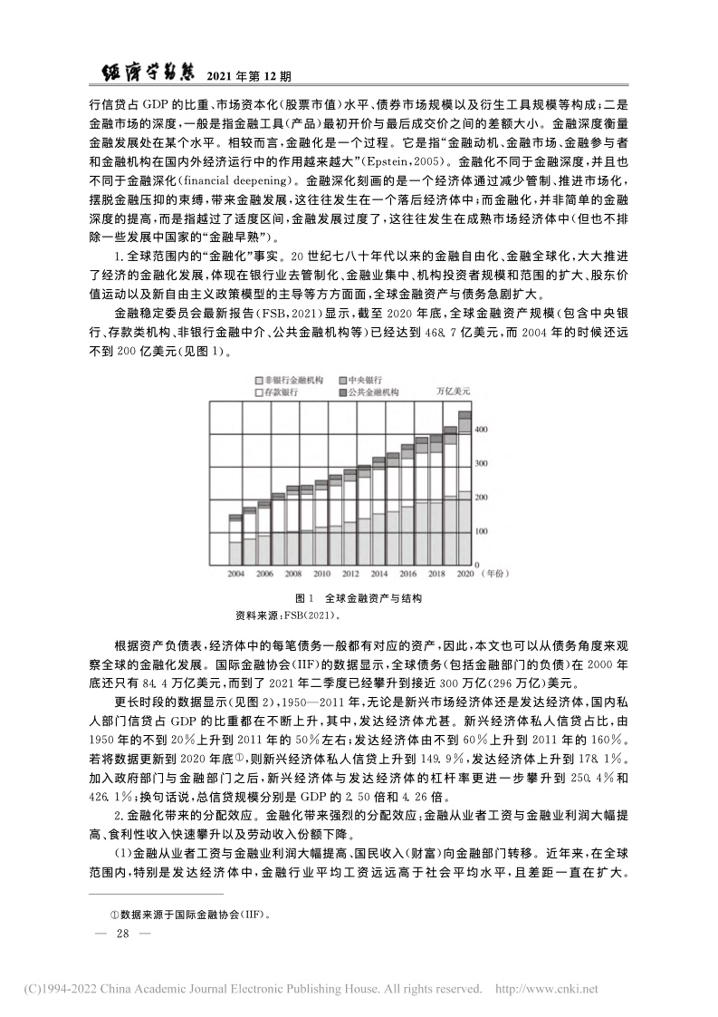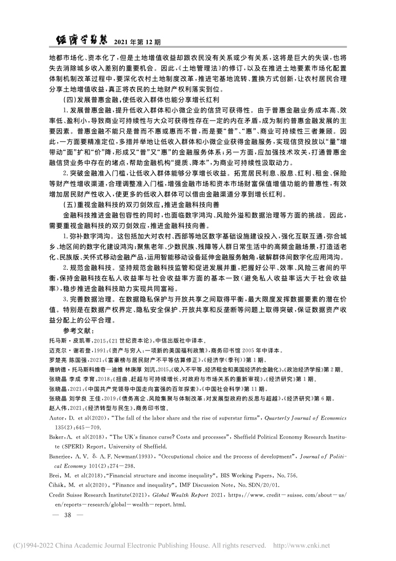 世界银行 (Demirg-Kunt & Levine, 2009)与国际货币基金组织也对金融与不平等问题展开了较为全面的梳理和研究。他们的理论与实证分析表明:金融影响不平等的机制较为复杂;金融在一定条件下会促进增长以及减少不平等,但无论是金融压抑(过度管制以及金融市场不发育)还是金融过度发展(如金融化)都可能导致不平等加剧。相较于之前的文献,2008年国际金融危机以来的文献对于金融的负面影响(特别是对分配的影响)关注较多。