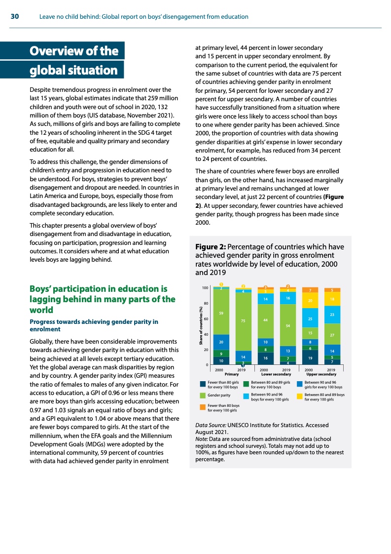 报告说,在全球范围内,男性和女性的高等教育入学人数比例为88:100。在73个国家,接受高中教育的男生比女生少,情况相反的国家为48个。相关数据突出了一个全球现象:童工和贫困等因素阻碍了男童充分参与学习,并导致其留级和辍学。