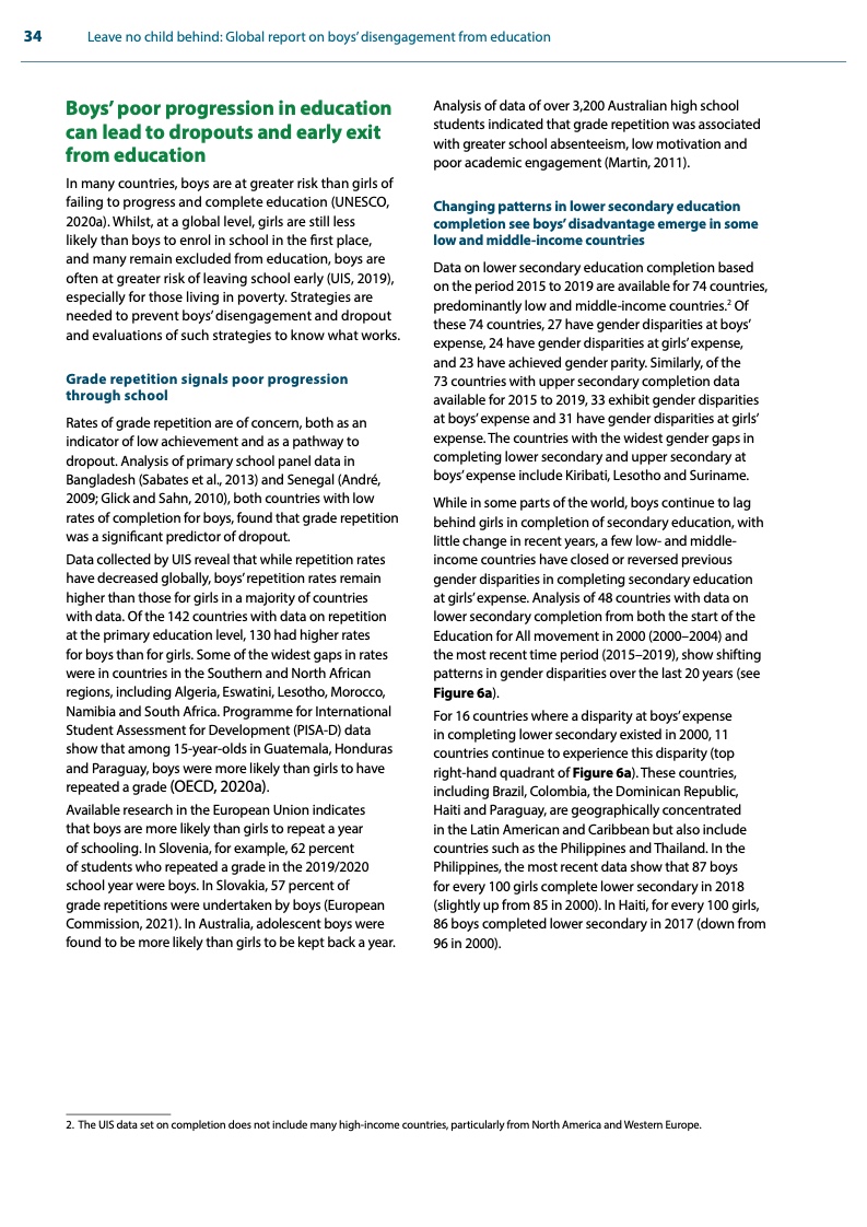 报告透露,在一些国家,男孩在教育上落后的迹象已经在初等教育结束时即已显现。在有相关数据的57个国家中,10岁男童在阅读技能方面的表现比女童差,而青春期男孩在中学阶段的阅读技能方面继续落后于女孩。东亚和太平洋地区、拉丁美洲和加勒比地区以及阿拉伯国家都表现出这一趋势,这些亦是男童辍学风险最高的地区。