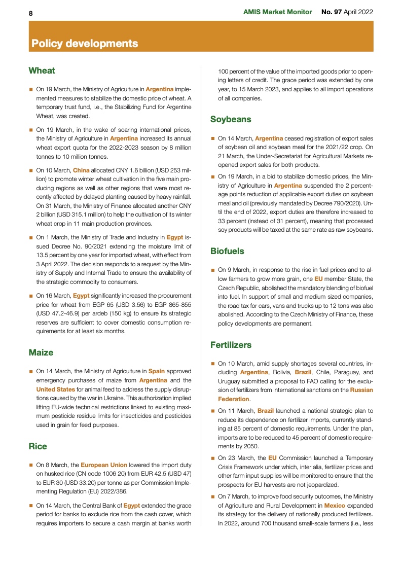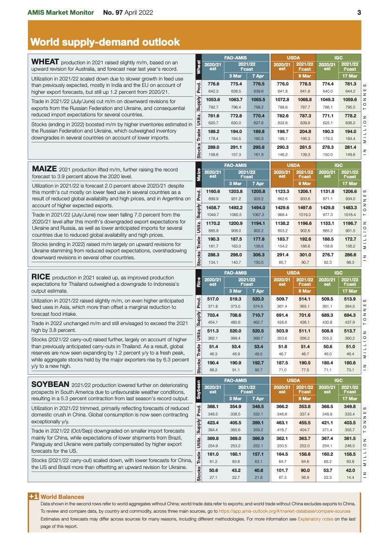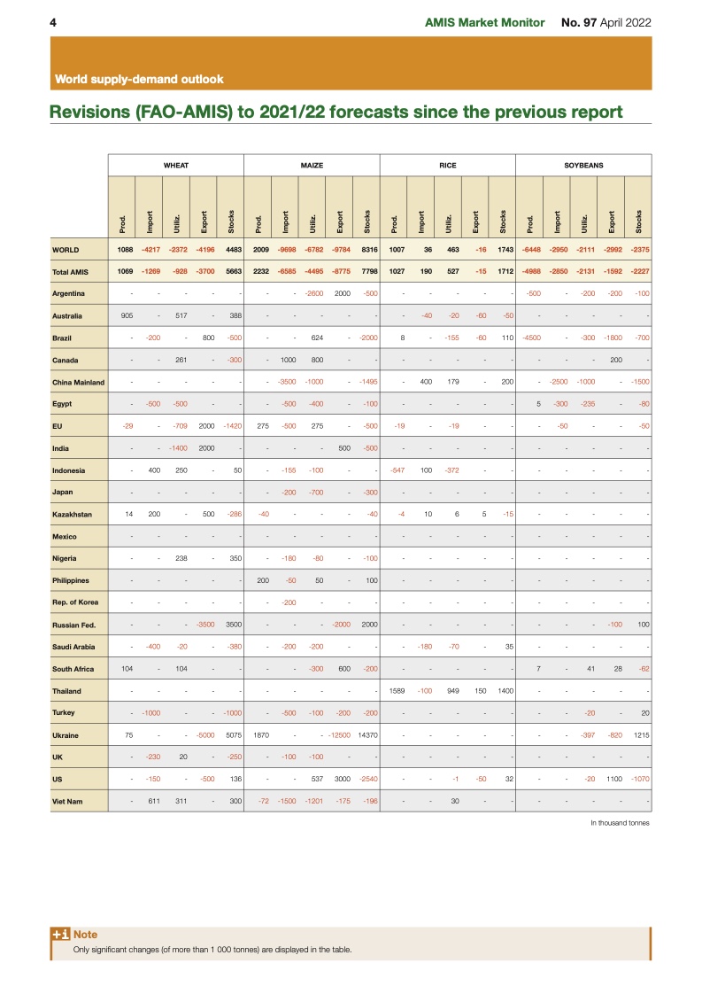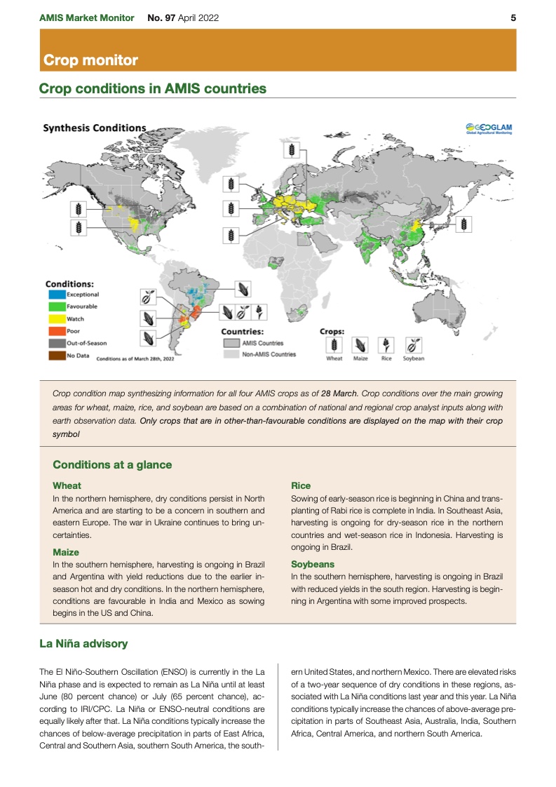 市场继续被各种冲突搅乱。价格波动很大,因为小麦和其他商品的传统买家现在正争相寻找新的供应商。对于小麦来说,人们的注意力正转向北半球秋播作物的状况,未来两个月将是关键。春季种植也将受到密切关注。来自美国的早期迹象表明,小麦种植面积不太可能增加;但是,大豆种植面积可能会反弹,以应对南美作物干旱减产和化肥价格暴涨的情况。