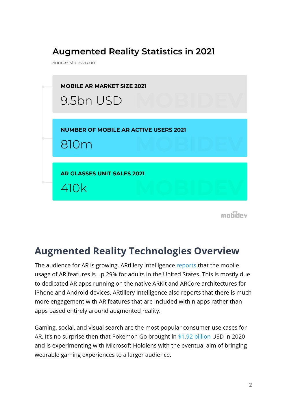 价值95亿美元的增强现实市场不断增长,这将是一个非常重要的细分市场,利用AR 技术驱动的应用程序可以保持竞争力,为8.1亿移动AR活跃用户提供服务。MobiDev的增强现实开发指南将带您了解 2022 年AR应用开发的主要技术、设备和平台。
