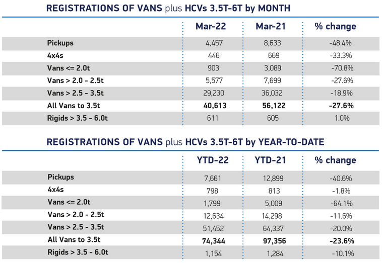 根据汽车制造商和贸易商协会(SMMT)发布的最新数据,3月份英国轻型商用车(LCV)市场下降了27.6%,达到40613辆。与去年3月相比,下降的幅度更大,当时被压抑的需求促成了自1999年以来LCV注册量的最大增幅。