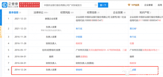 企查查显示,2014年12月,农行广州东城支行的行长是许朝露接替了曾奋明,想来在此之前黎朝便已调任他处。