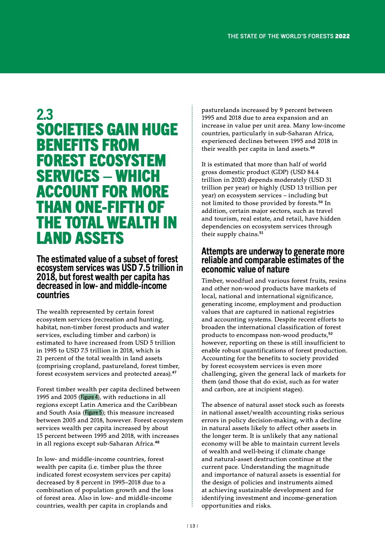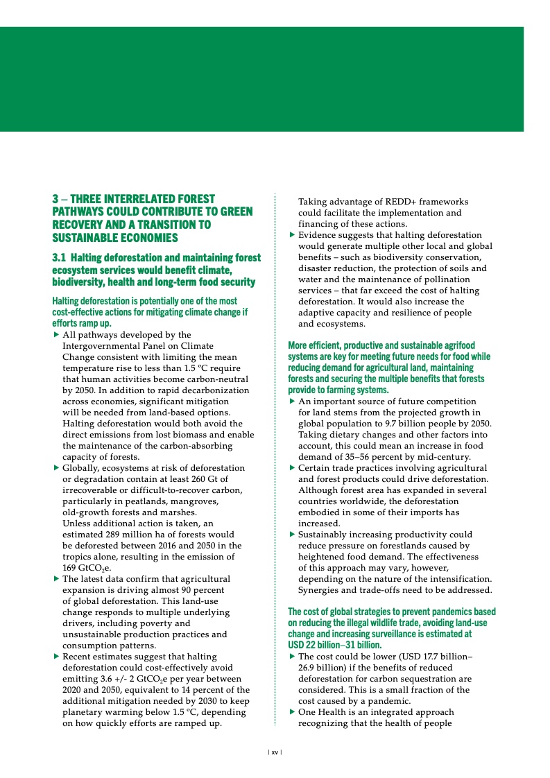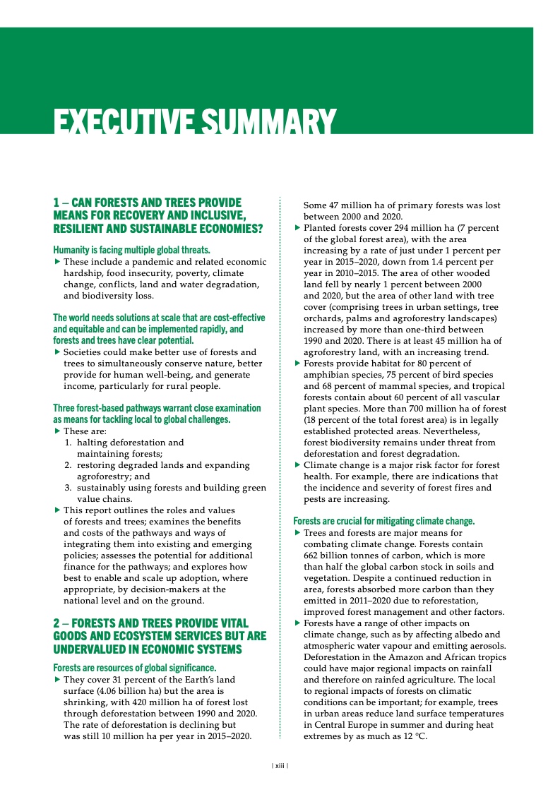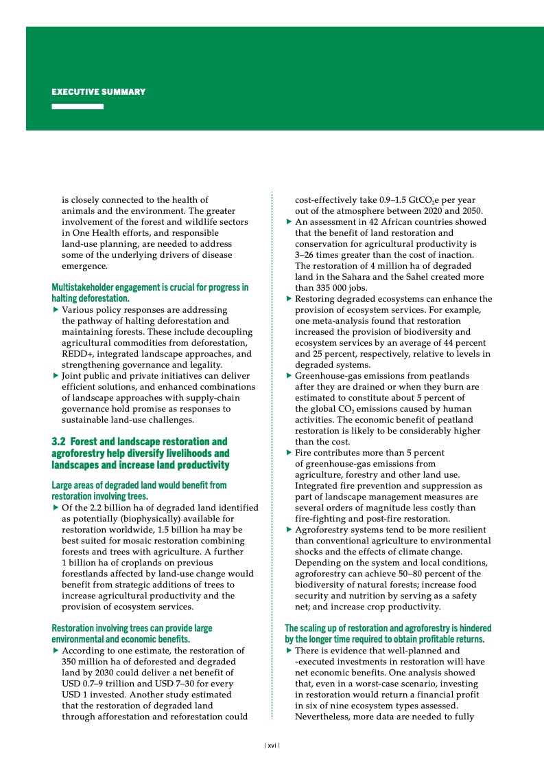 报告认为,全球社会可以更好地利用森林和树木来保护自然,并更好地为人类提供福祉,促进创收,特别是帮助农村人口创收。报告强调,“如果我们的地球不健康,就不会有健康的经济” 。