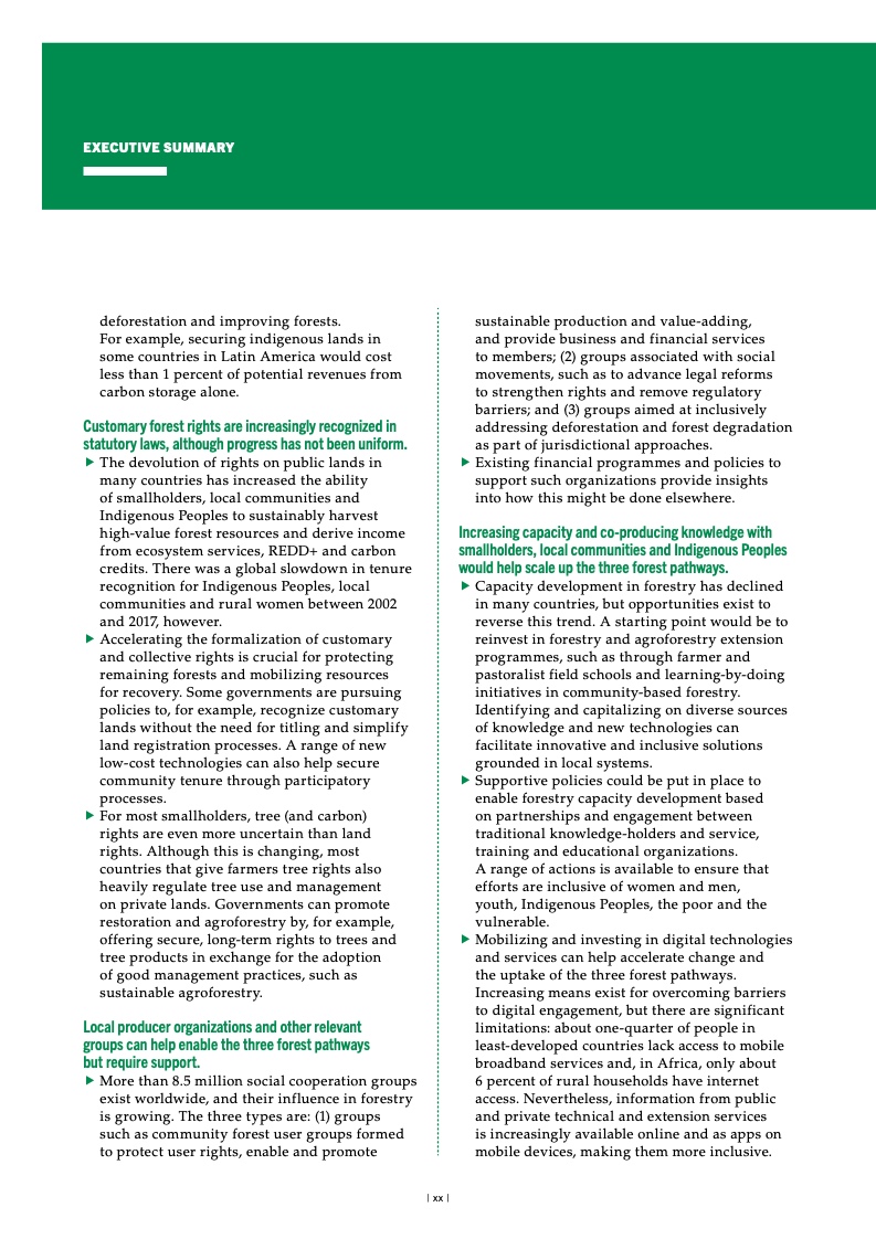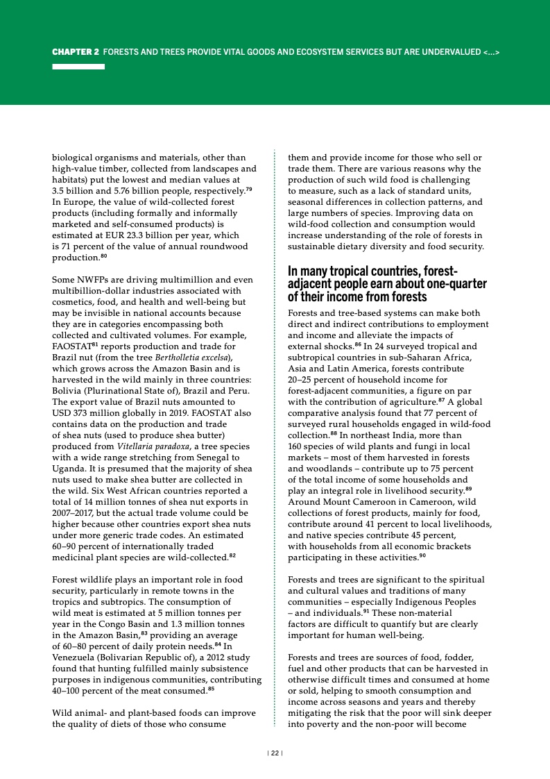 报告援引了全球各地的大量实例,证明森林和树木对人民生计至关重要,包括土耳其的非木材森林产品和格鲁吉亚的薪柴燃料开发,中国和越南的小规模林业,科特迪瓦的可持续木炭生产以及哥伦比亚的土地权利正式化进程。
