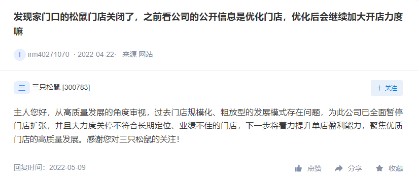 对此,三只松鼠5月9日回复称,从高质量发展的角度审视,过去门店规模化、粗放型的发展模式存在问题,为此公司已全面暂停门店扩张,并且大力度关停不符合长期定位、业绩不佳的门店,下一步将着力提升单店盈利能力,聚焦优质门店的高质量发展。