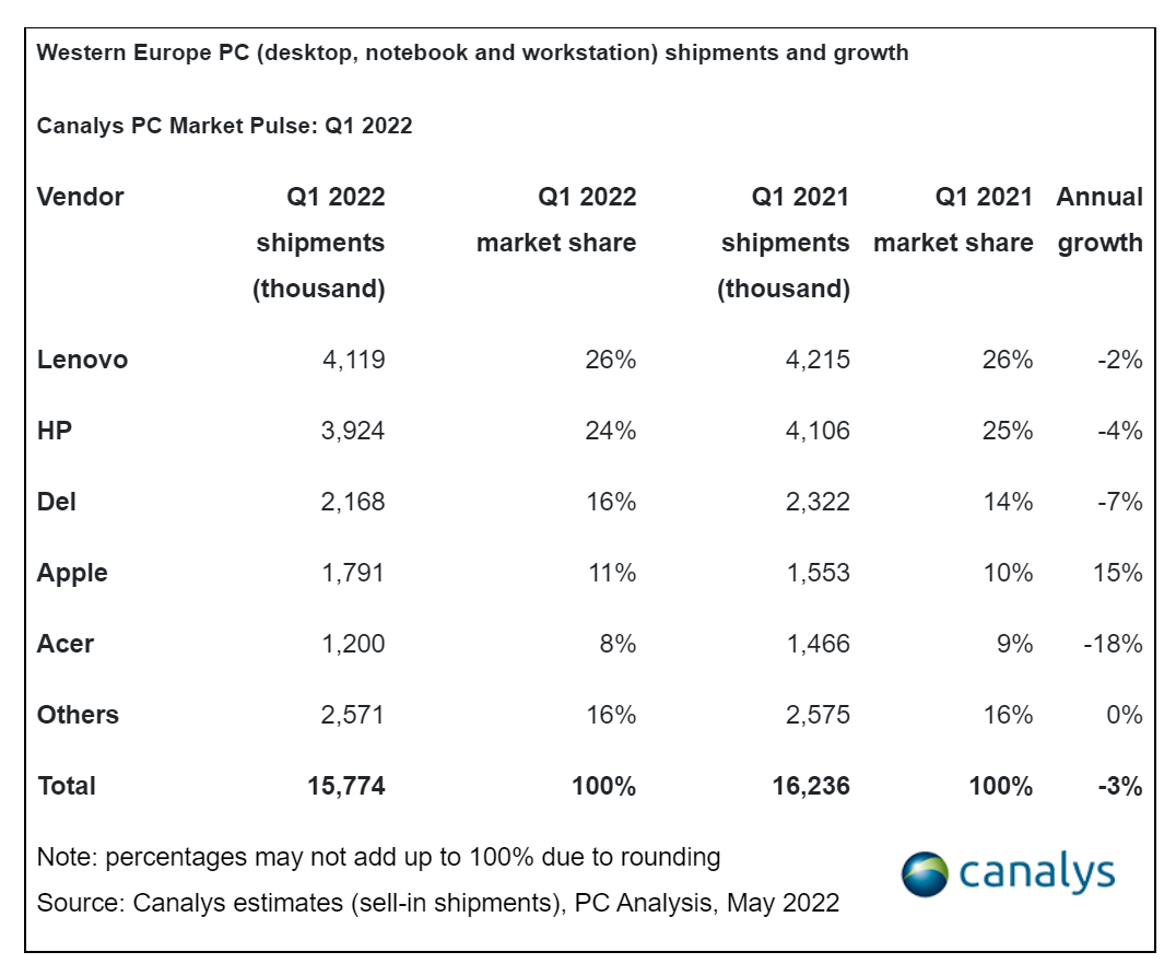 2022年第一季度,西欧的PC出货量(台式机、笔记本电脑和工作站)达到1580万台,比2021年第一季度下降3%。供应瓶颈、衰退威胁和日益加剧的地缘政治紧张局势限制了2022年初的增长。