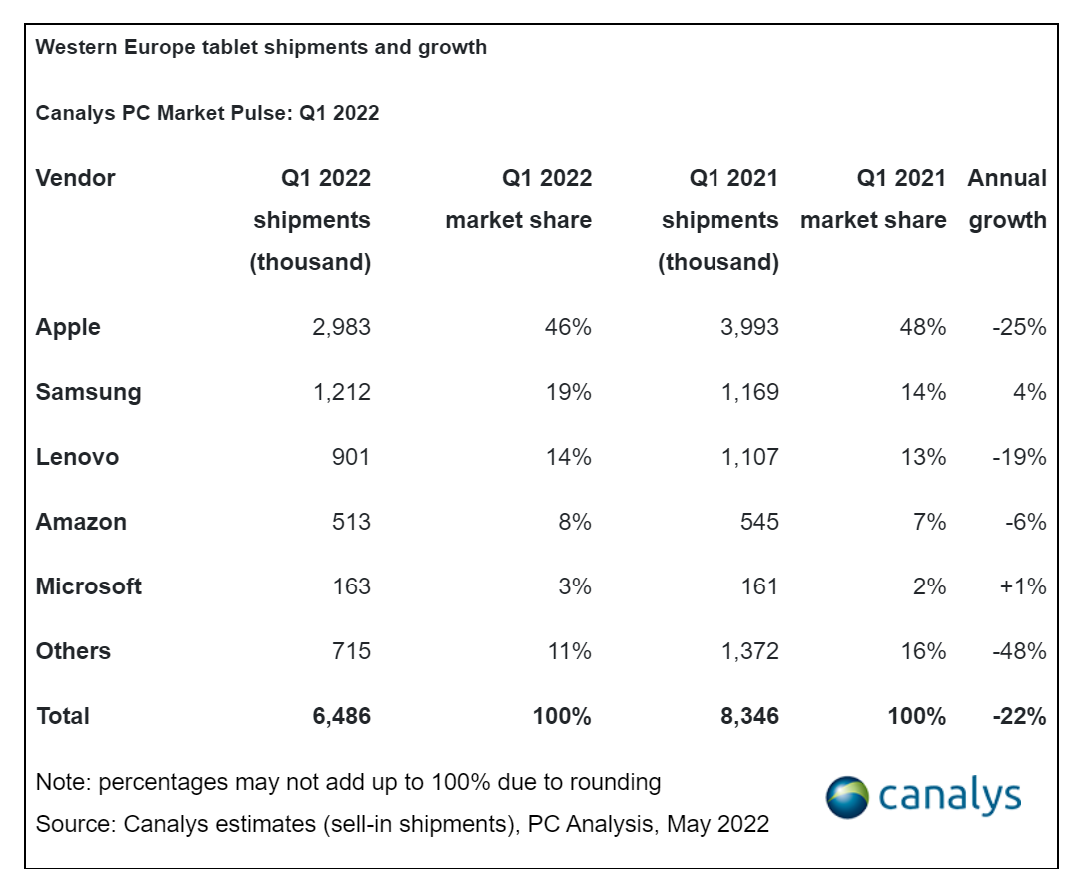 西欧平板电脑市场在2022年第一季度继续下滑,这已经是连续第三个季度下滑,出货量下降22%,降至650万台。