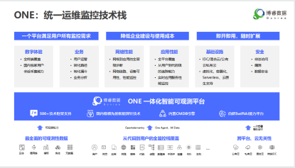5月20 日,博睿数据正式推出了一体化智能可观测平台ONE,该平台旨在建立一体化、智能化、面向业务与用户体验的统一运维平台,助力企业提高数字化体验,降低运维成本,提升工作效率,为数字化转型赋能升级。同时,这也是业界第一个将所有运维监控需求“All in ONE”的统一平台。