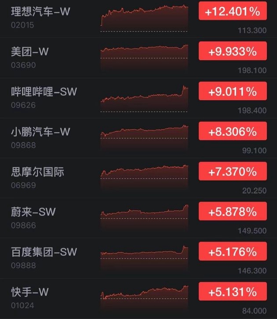 新浪科技讯 6月6日下午消息,港股恒生指数收涨2.71%,恒生科技指数涨4.64%。新能源汽车股大幅领涨,理想汽车港股收涨超12%,小鹏汽车涨超8%。互联网科技股普涨,美团涨近10%,哔哩哔哩涨超9%,快手、百度涨超5%。