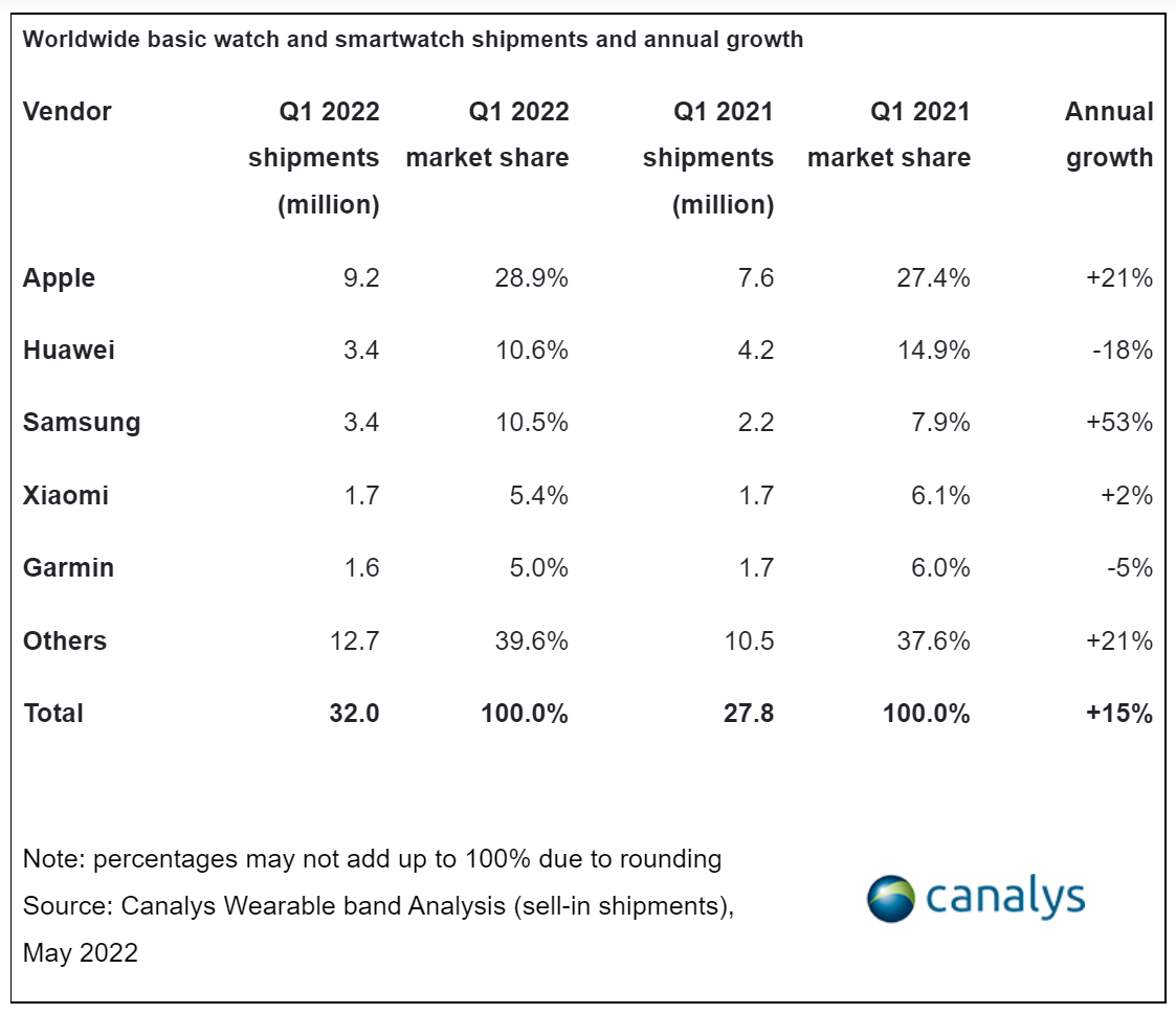 根据 Canalys 的最新估计,2022年第一季度全球可穿戴手环出货量下降4%,降至4170万块。与此同时,从腕带到手表的转变仍在继续。由基础款手表和智能手表结合而成的腕表占本季度所有可穿戴腕带出货量的76.6%,同比增长15%, 达到3200万块。基础手环下降37%,这是自2020年第四季度以来连续第六个季度下降。基础手环出货量在2019年第四季度达到峰值(2790万块)后首次跌破1000万块。在整体可穿戴手环市场下滑的情况下,手表出货量的增加抵消了基础腕带的下降趋势。