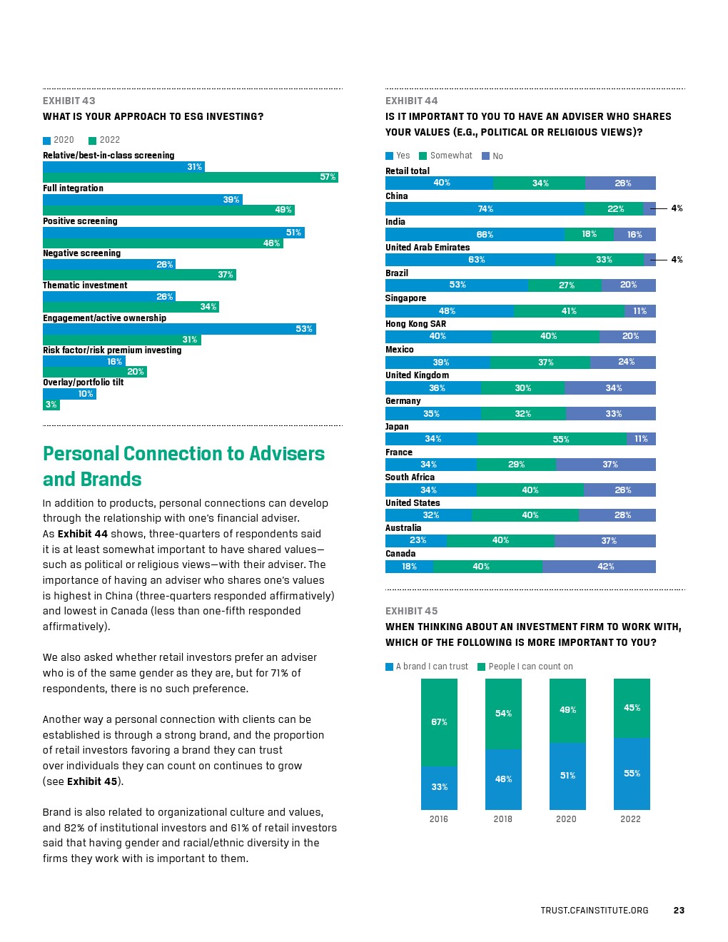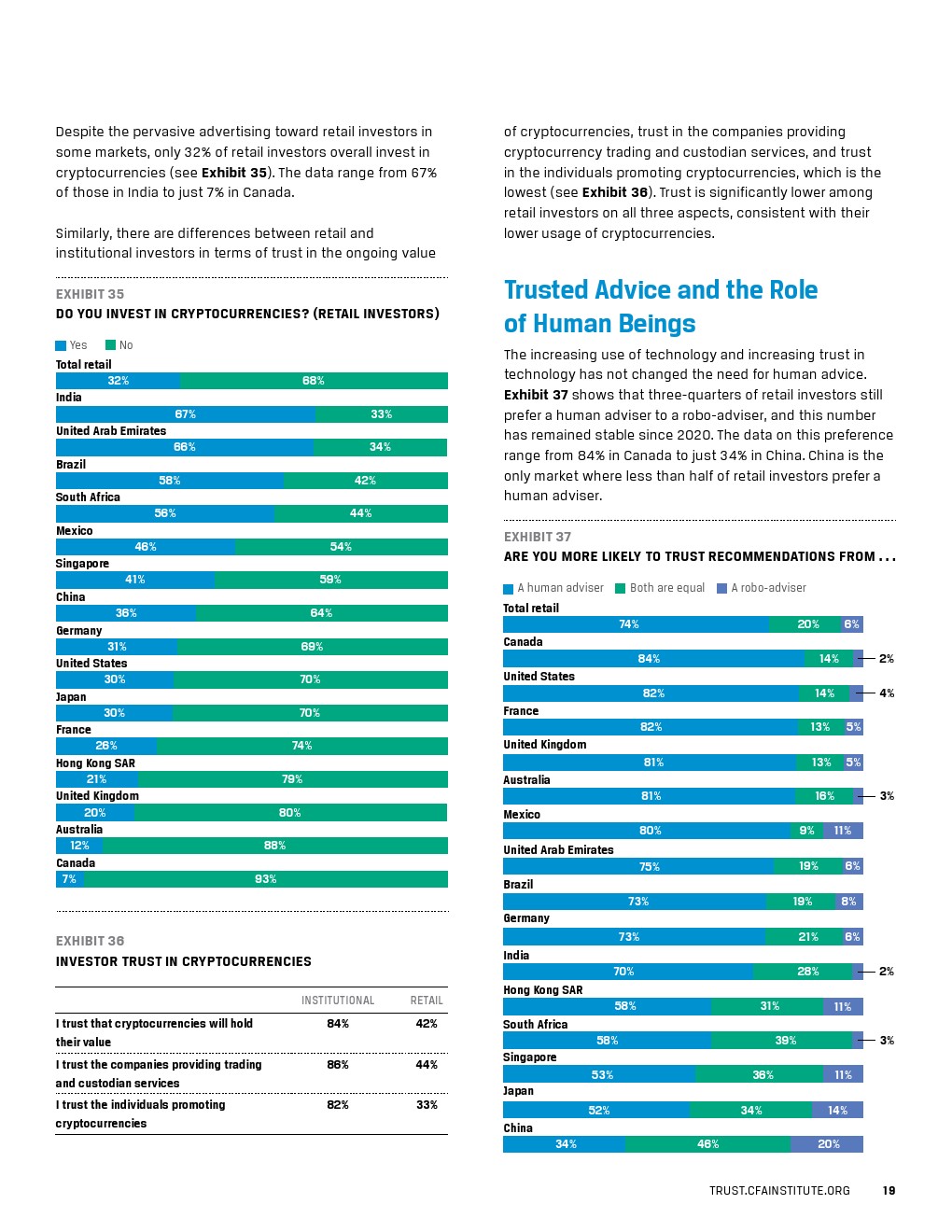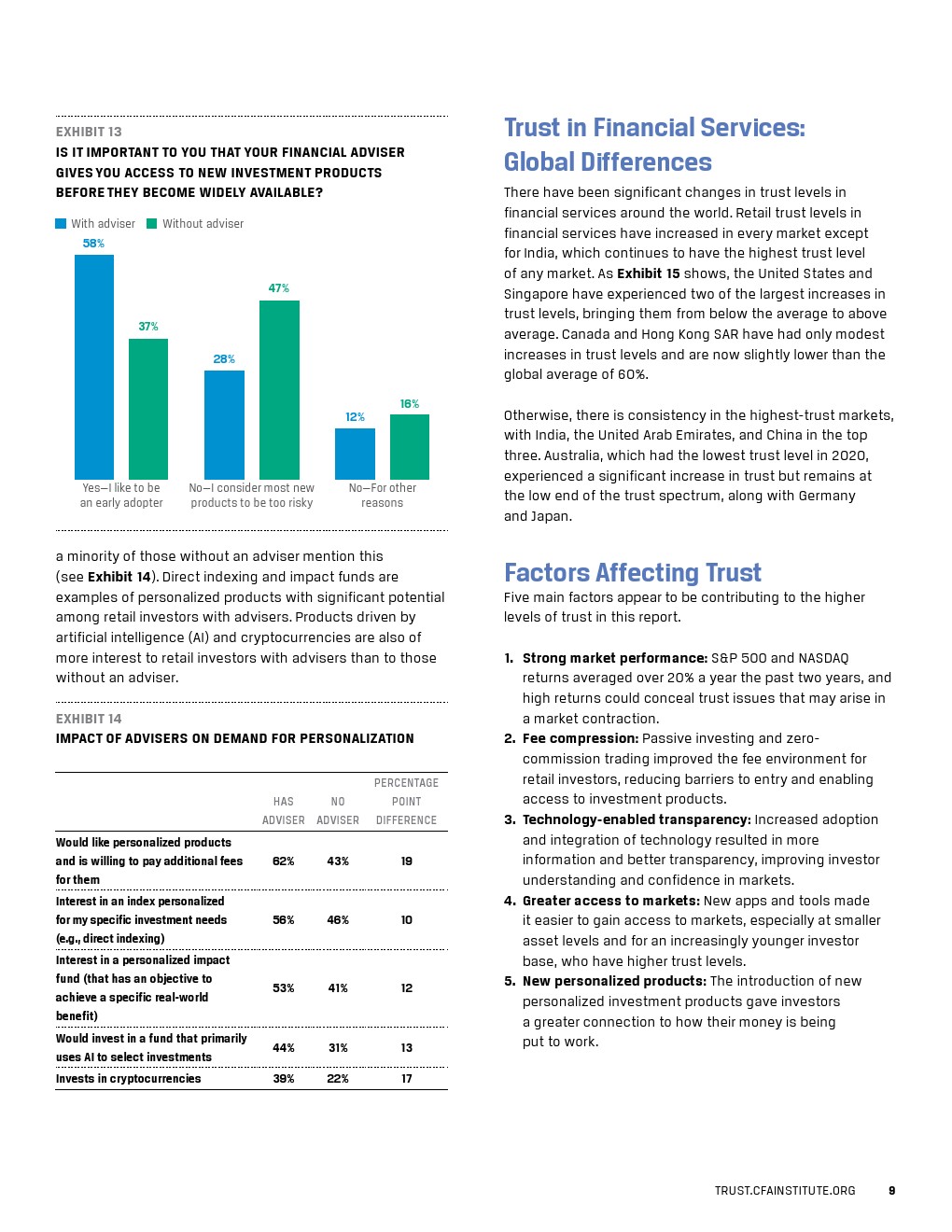 报告还研究了投资者群体之间的信任鸿沟,包括跨地域市场、世代之间以及有和没有顾问的公众投资者之间的差异。