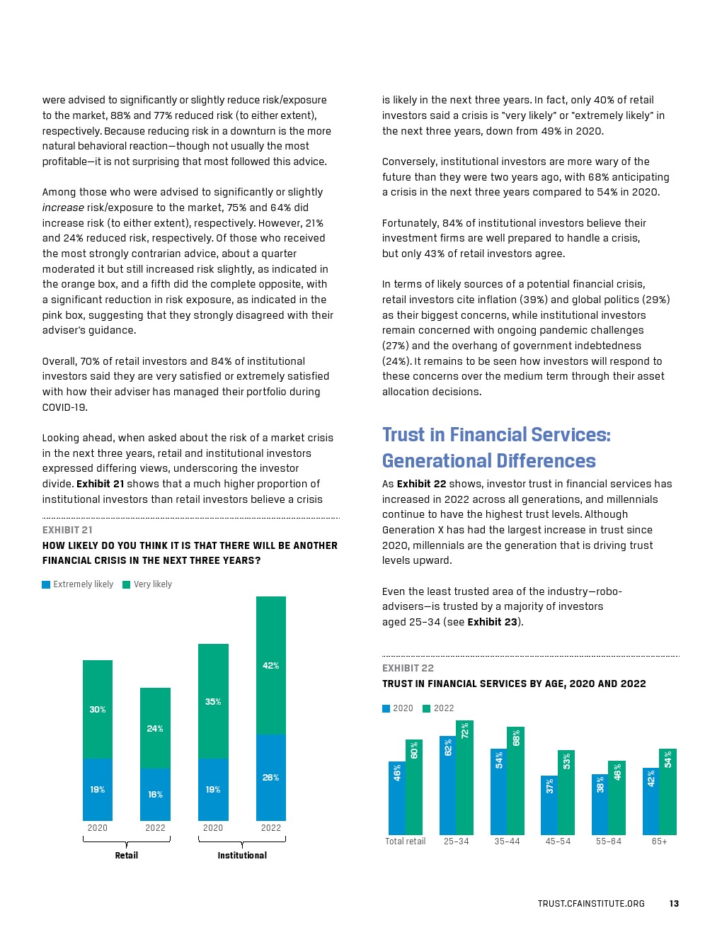 2022 年的报告发现,自 2020 年以来公众和机构投资者对金融服务的信任度显著提高。机构投资者(如保险公司、养老基金、捐赠基金等)通常对管理其资产的公司具有较高的信任度,并对这些公司提供的价值感到满意。公众投资者总体上也表现出较高的信任度,尽管他们的信任度低于机构投资者。重要的是,有顾问的公众投资者和没有顾问的公众投资者之间的满意度不同。