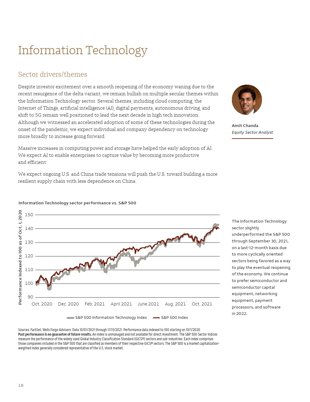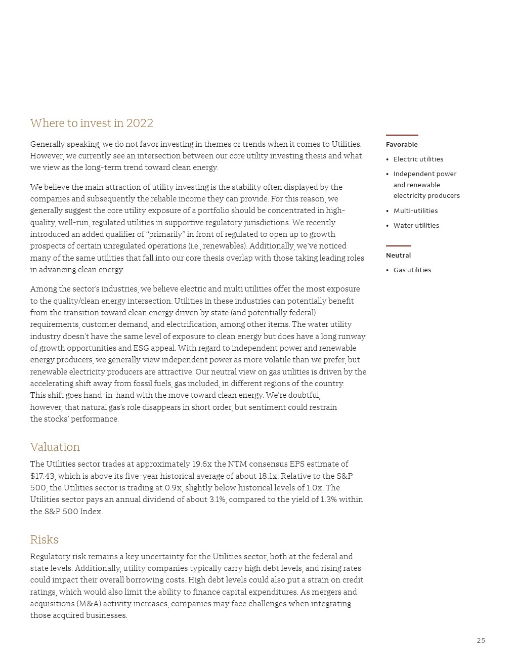 与之前的周期不同,美国和全球石油或天然气生产商都保持自律,不会通过增加产量来应对能源商品价格上涨。随着能源公司继续将资本重新集中在去杠杆和股东回报上,我们认为这种供应趋势将持续到2022年。在2021年能源板块表现强劲之后,我们注意到估值仍低于历史平均水平,我们认为2021年形成的结构性发展为能源板块的投资者提供了改善的基本面。