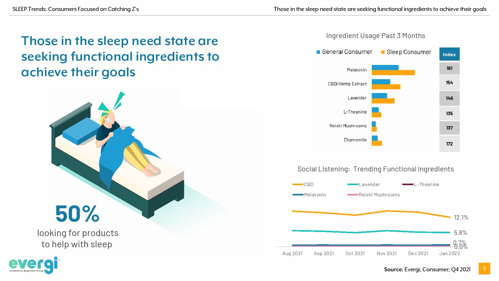 睡眠是人类生存的基本需求,但并不是每个人的睡眠都很好。事实上,许多消费者有睡眠方面的问题,无论是入睡还是保持优质睡眠。最新研究发现,46%的美国消费者处于睡眠需求状态,自2021年第三季度以来增长了17%。处于这种需求状态的消费者要么在与睡眠作斗争,要么积极地将睡眠作为首要任务。他们愿意同时使用功能性成分和消费品来获得所需的睡眠。
