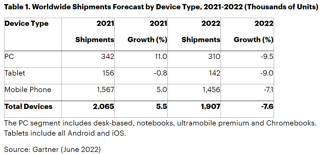 总体而言,2022年全球电子设备(个人电脑、平板电脑和手机)出货量将下降7.6%。