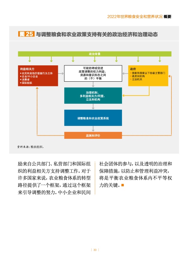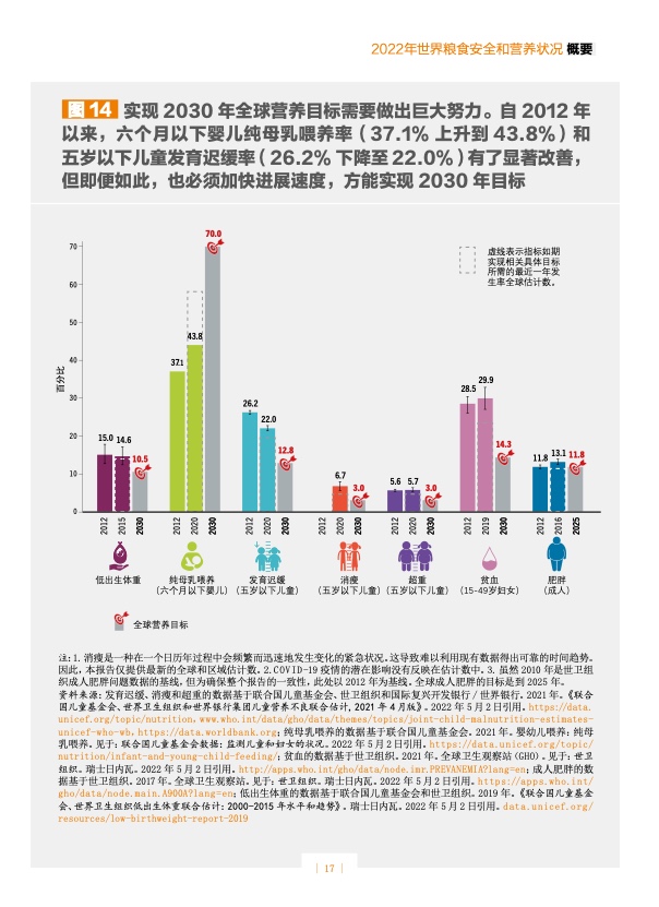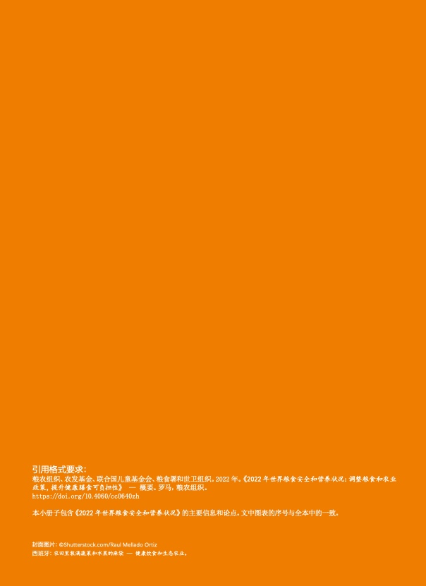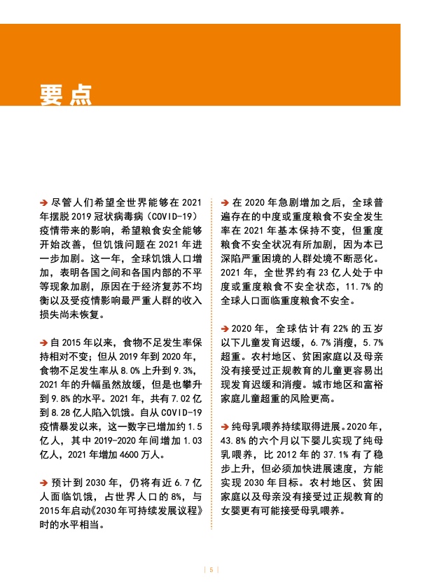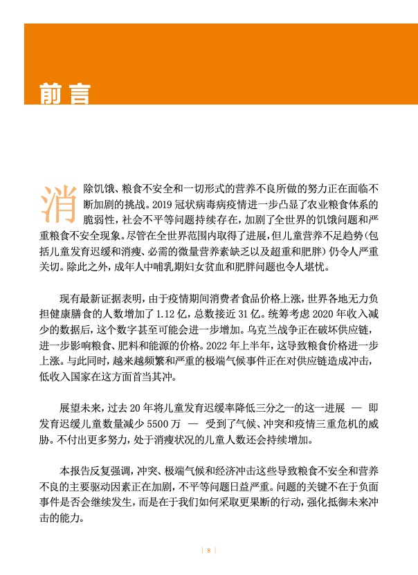 报告编写期间,俄乌冲突仍在持续,交战双方均是全球重要的主粮、油料和肥料生产国。受此影响,国际供应链中断,粮食、肥料、能源和严重营养不良儿童的即食治疗性食品价格上涨。冲突爆发前,各国尤其是低收入国家的供应链已然受到日益频发的极端气候事件的不利影响,因此冲突可能会对全球粮食安全和营养产生深远影响。