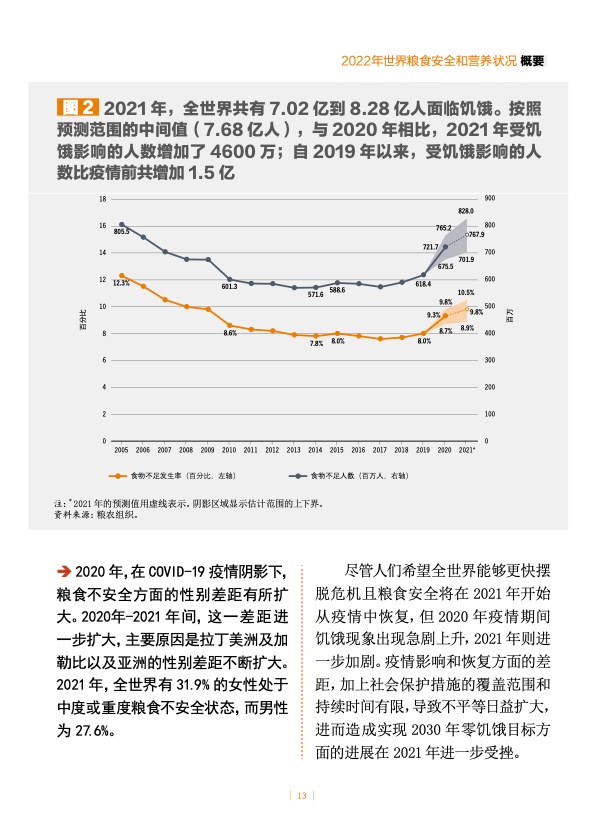 2021 年有 8.28 亿人受饥饿影响,较 2020 年增加了 4600 万,较 2019 年增加了 1.5 亿。