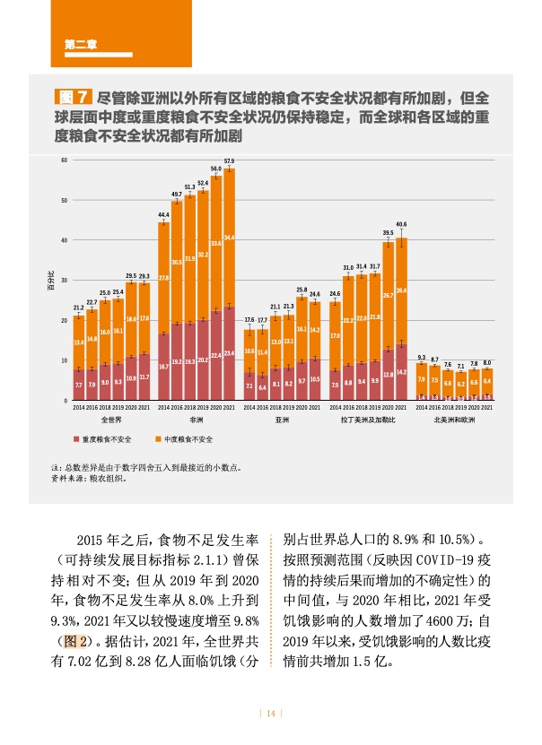 2021 年,全球约有 23 亿人(占比 29.3%)面临中度或重度粮食不安全状况,较新冠疫情暴发以来增加了 3.5 亿。全球近 9.24 亿人(占比 11.7%)面临严重粮食不安全状况,两年间增加了 2.07 亿。