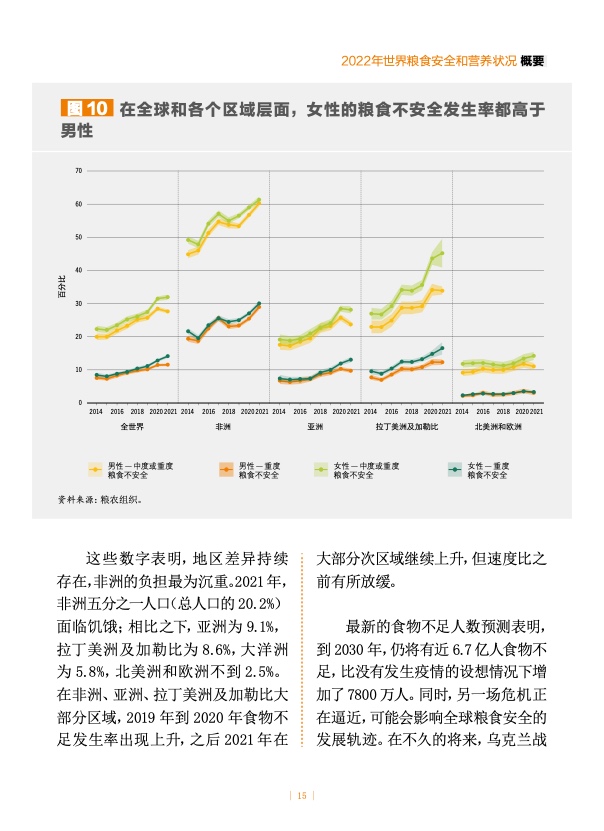 从 2015 年起,世界饥饿人口所占比例相对稳定,却在 2020 年急剧上升,并在 2021 年继续升至 9.8%,高于 2019 年的 8% 和 2020 年的 9.3%。