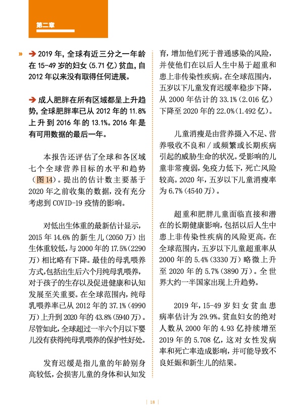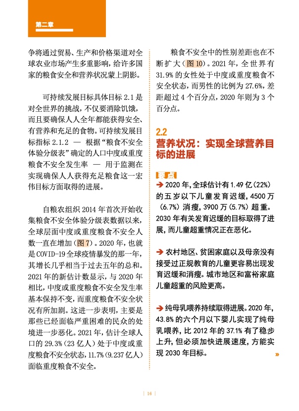 展望未来,即使全球经济实现复苏,预计到 2030 年仍将有近 6.7 亿人(占世界人口的 8%)面临饥饿,与 2015 年的水平相近。然而,也正是在 2015 年,《2030 年可持续发展议程》提出了到 2030 年消除饥饿、粮食不安全和营养不良的目标。