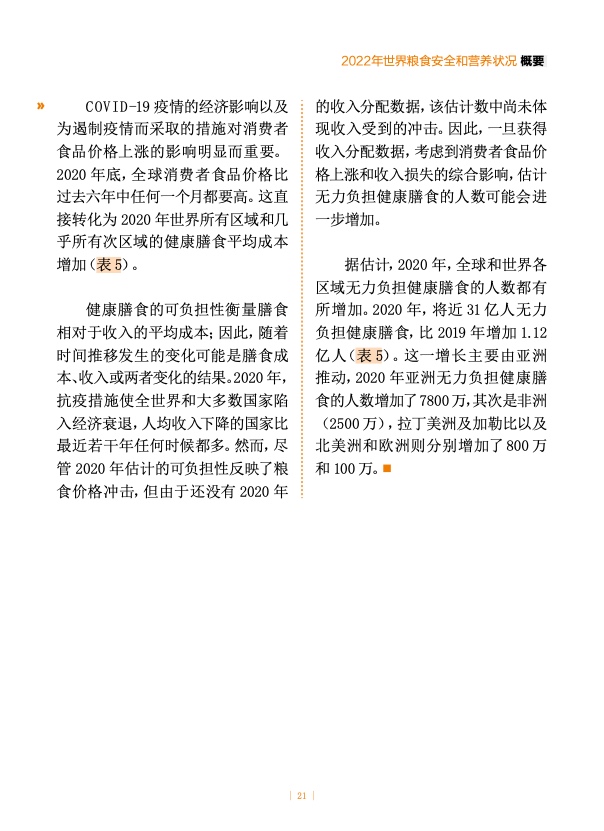 2020 年,新冠疫情及相关防控措施重创经济,食品消费价格随之上涨,以致近 31 亿人无力负担健康膳食,较 2019 年增加了 1.12 亿。