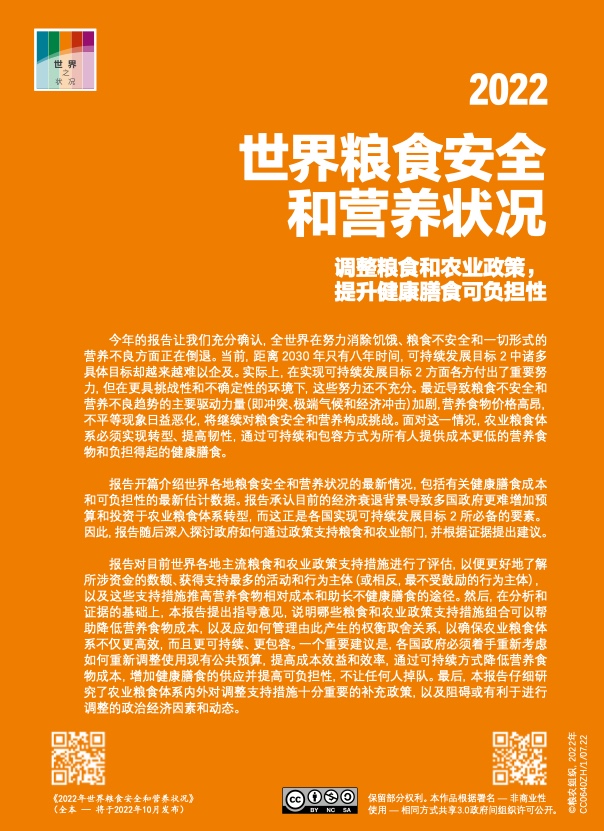 联合国粮食及农业组织(粮农组织)、国际农业发展基金(农发基金)、联合国儿童基金会(儿基会)、联合国世界粮食计划署(粮食署)和世界卫生组织(世卫组织)今天联合发布《2022 年世界粮食安全和营养状况》。