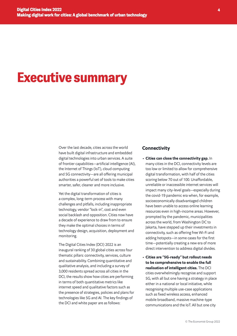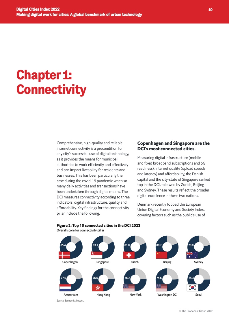 对任何城市来说,覆盖全且稳定的高速互联网是成功发展数字技术的先决条件。互联网能提升市政工作效率和质量,进而提高城市宜居性。在新冠疫情期间尤其如此,许多日常活动和交易需要通过数字工具进行。本指数将从三个角度衡量连通性:数字基础设施、互联网质量和负担能力。
