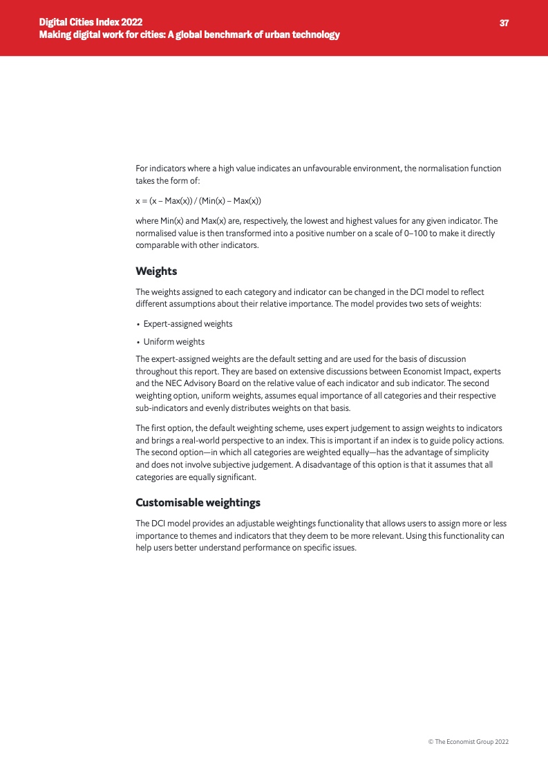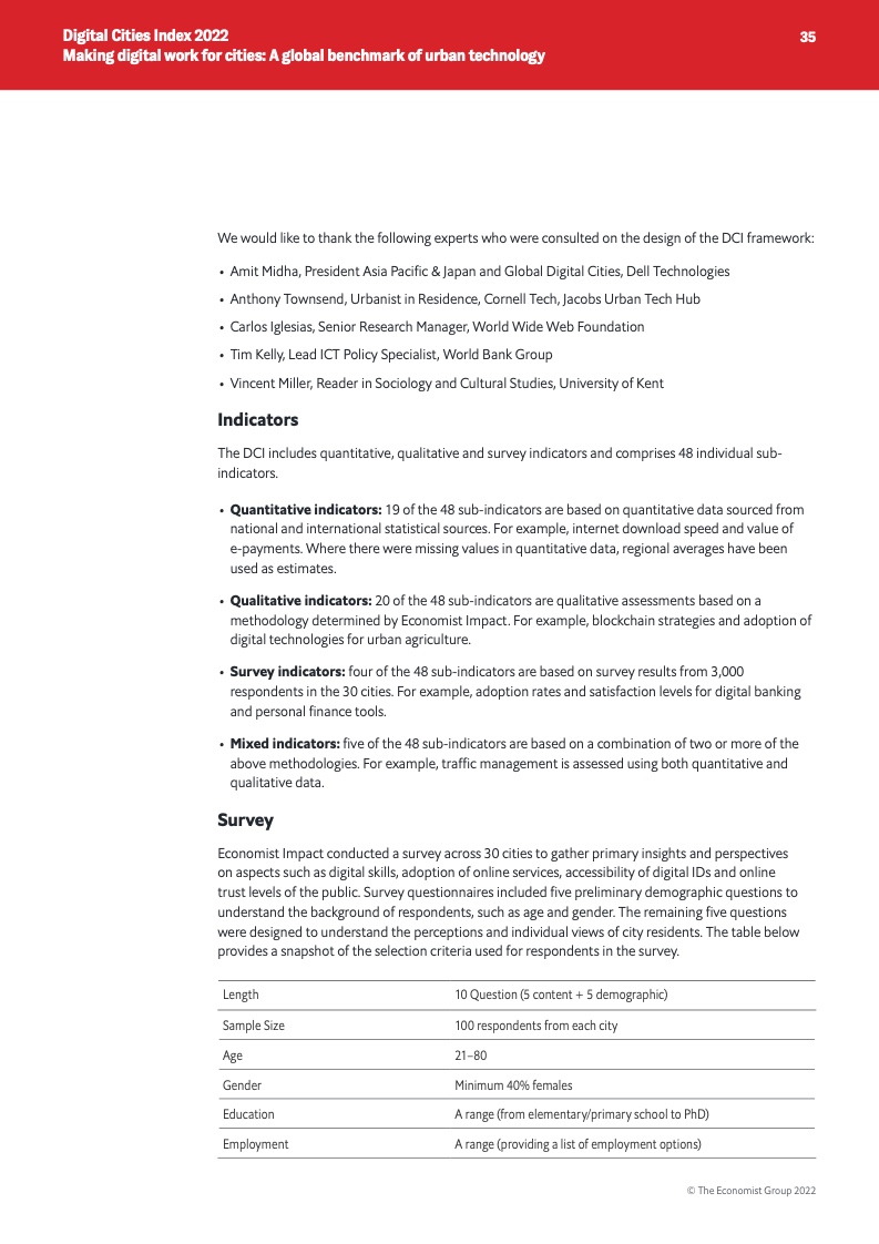 市政服务的效率影响着居民生活和企业运作,而数字技术可以极大地提高市政服务的效率。DCI评估的关键指标包括面向居民和企业的电子政务门户网站、无缝出行相关的数字技术(例如机场生物识别和一体化公共交通应用程序)以及健康和教育数字平台。