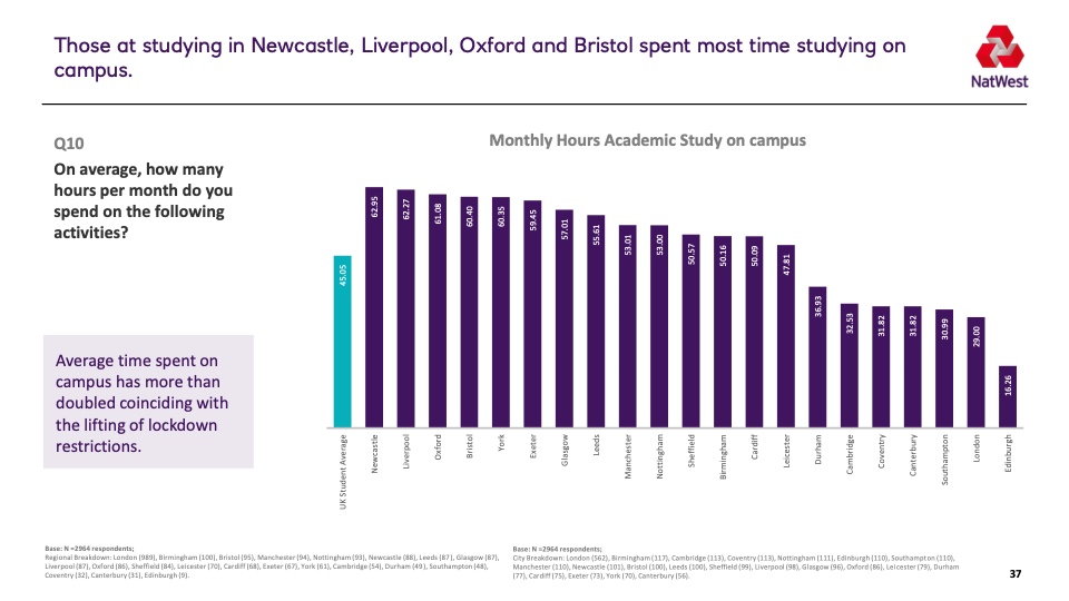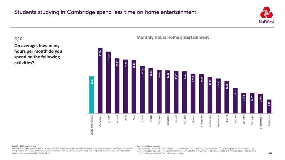 平均每月31镑,最高的是牛津学生,平均每月53镑,大概是因为牛津的学霸都把时间花在学习上了,毕竟每个月学习61+个小时呢,几乎比英国高校平均时间多出三分之二。