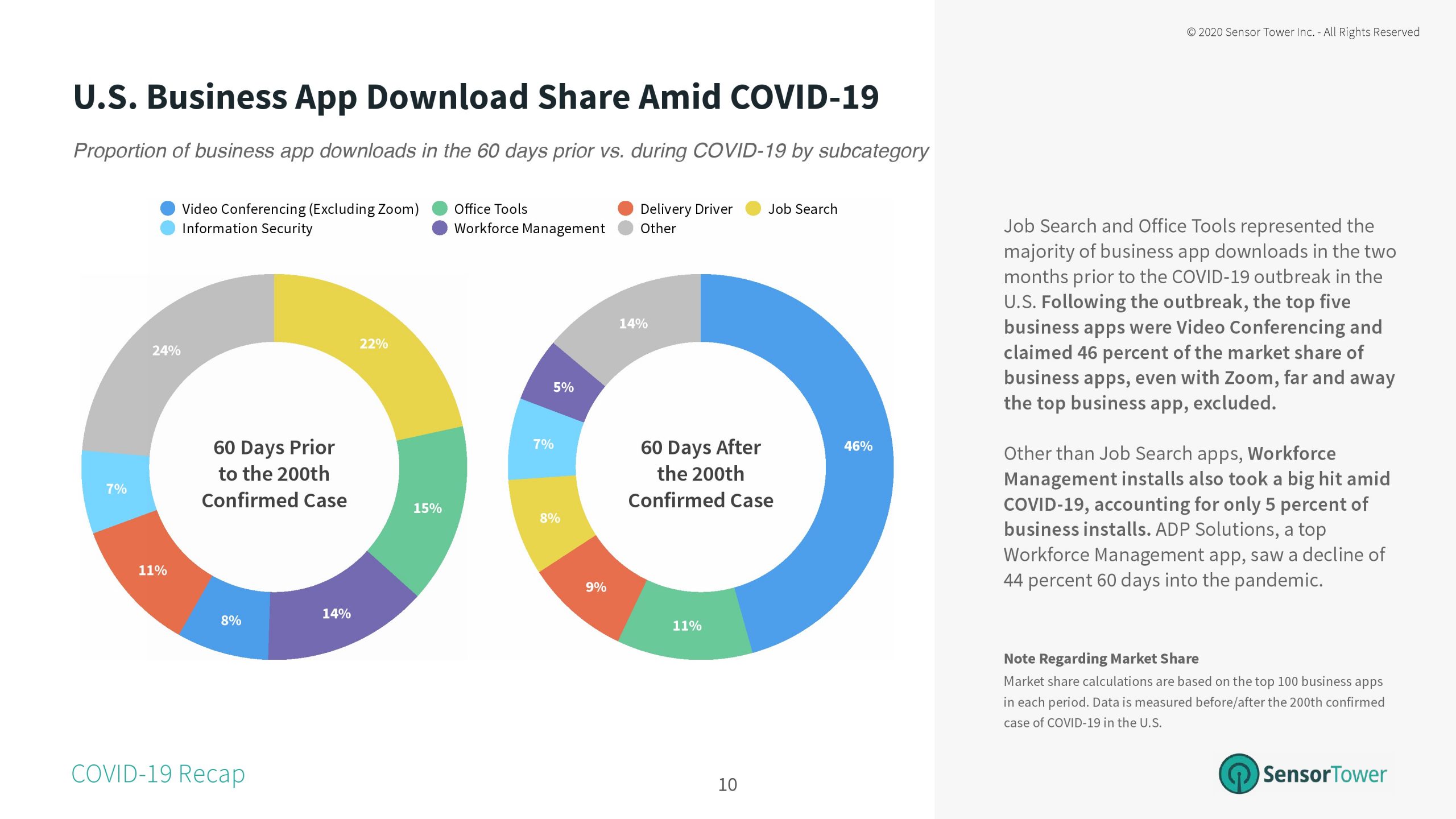 COVID-19对商务应用程序的影响导致2020年第二季度下载量首次超过10亿次。在COVID-19推动下下载量激增之前,商务应用下载量再全球范围内的稳定增长速度约为每年20%。
