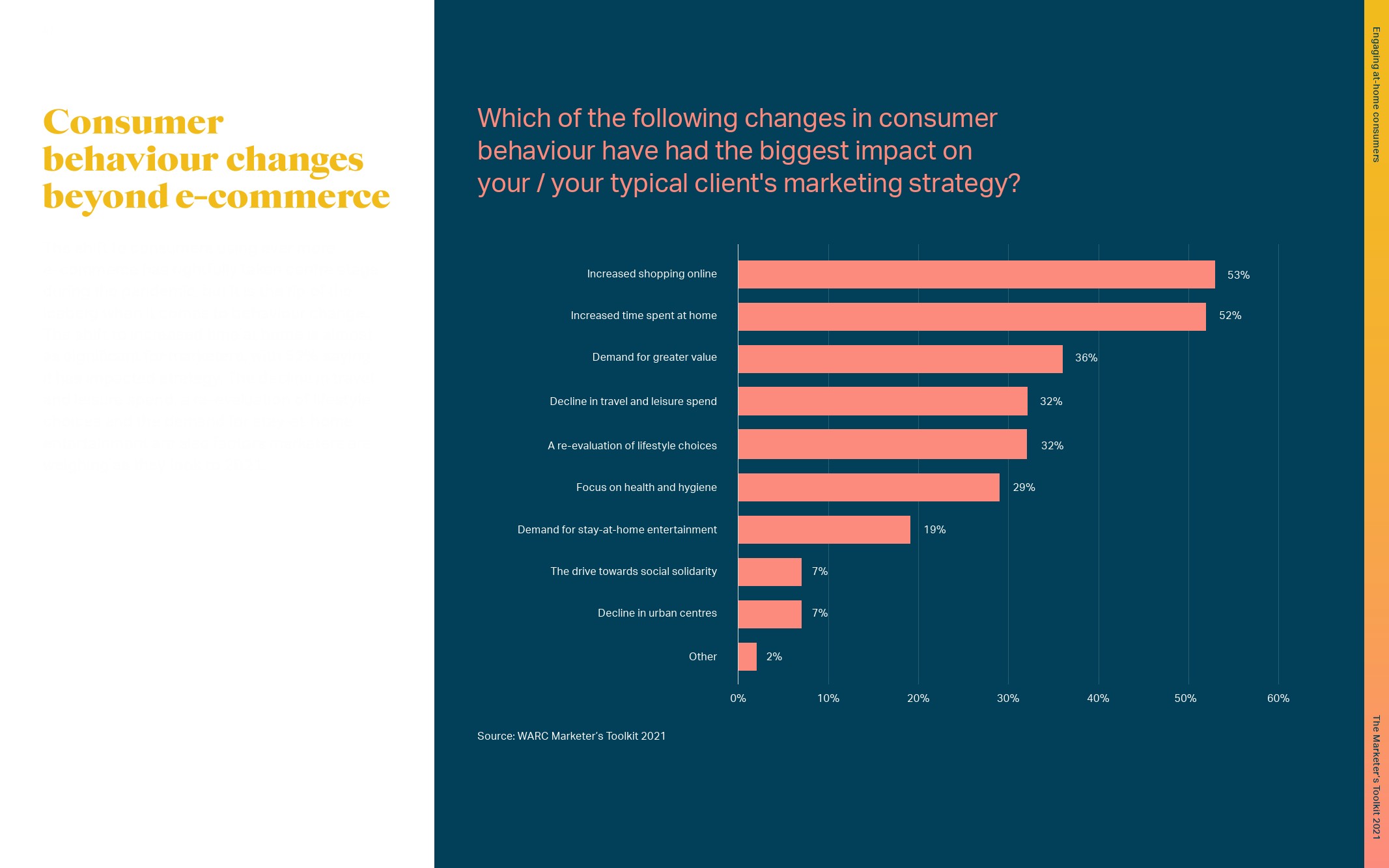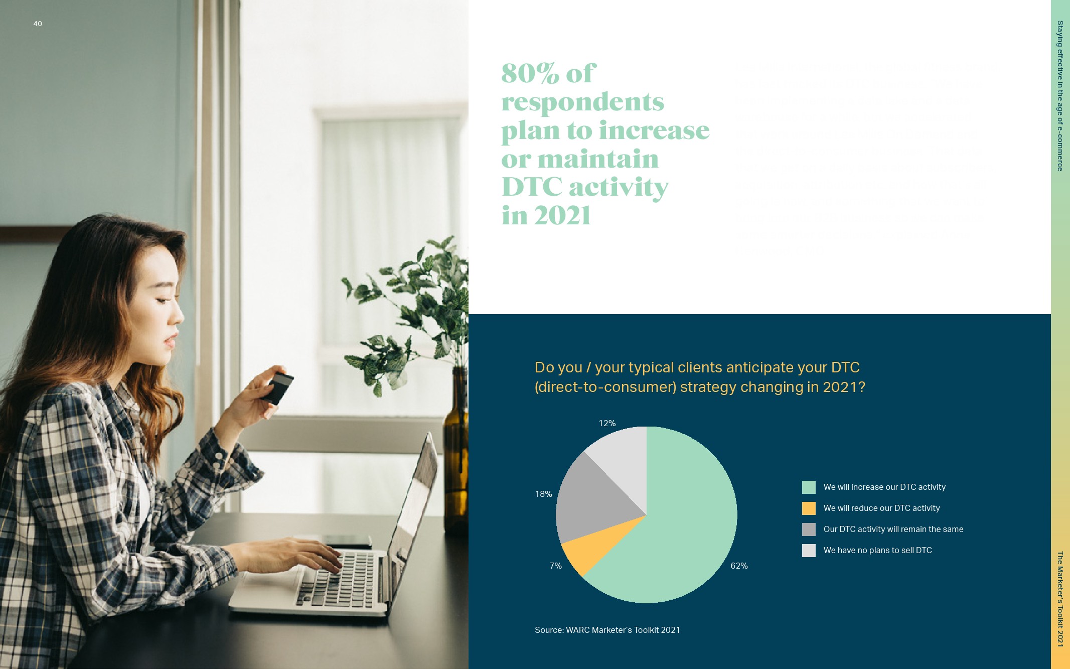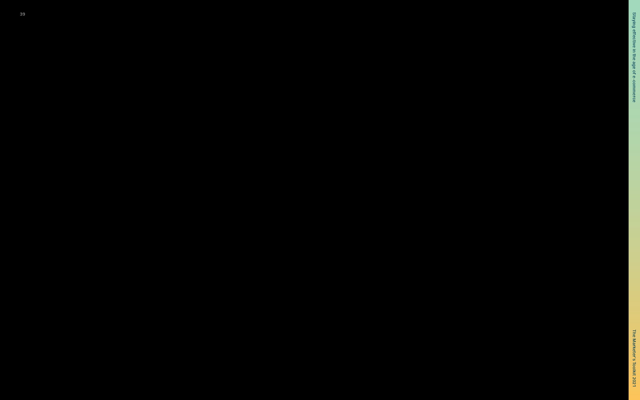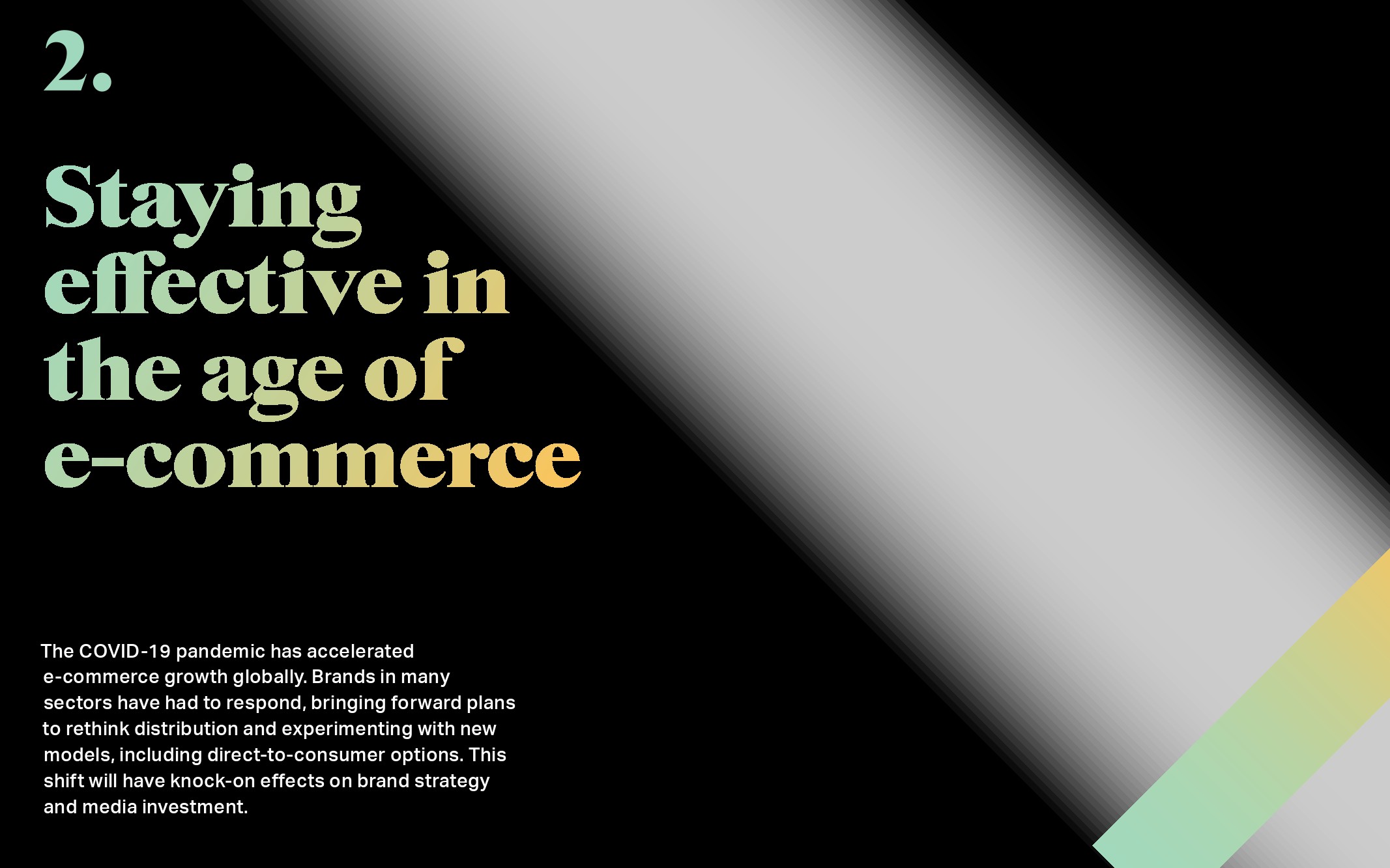 在电子商务时代保持效率。COVID-19大流行在全球范围内加速了电子商务的增长,大多数营销人员认为这种转变是永久的。应对这一趋势是2021年的头等大事。一些企业正在探索直接面向消费者的选择,寻找使消费者更容易重复购买的方法。这种转变将对品牌战略和媒体投资产生连锁反应。
