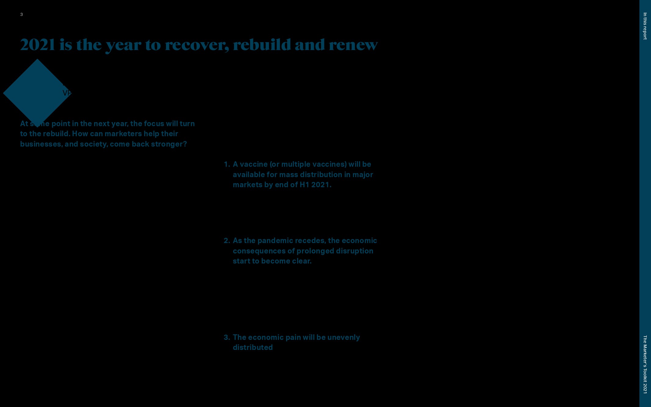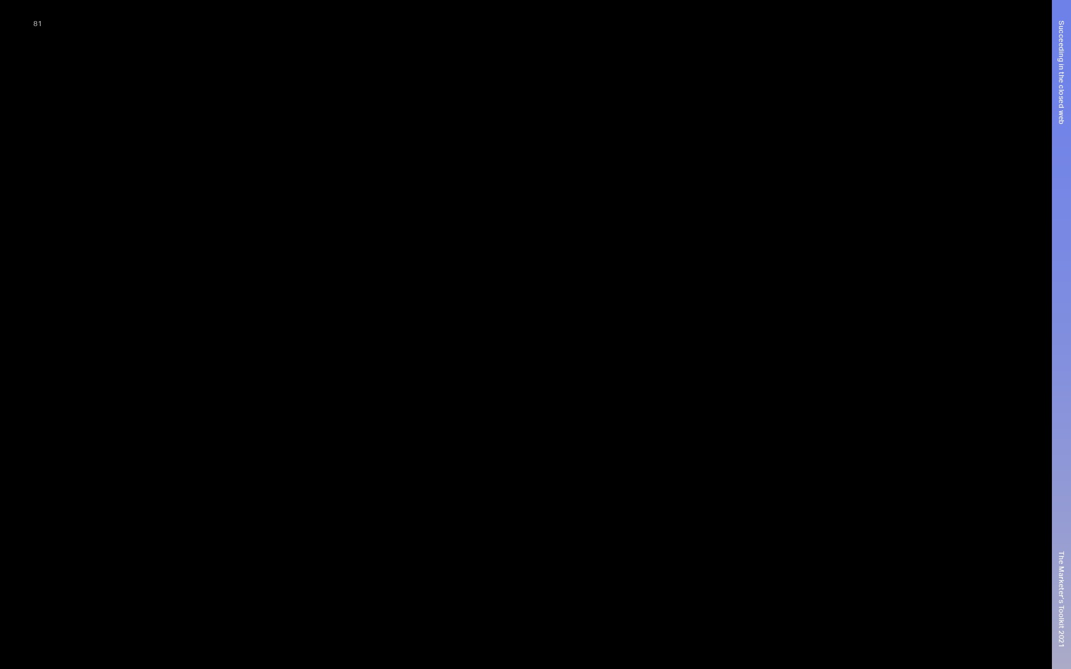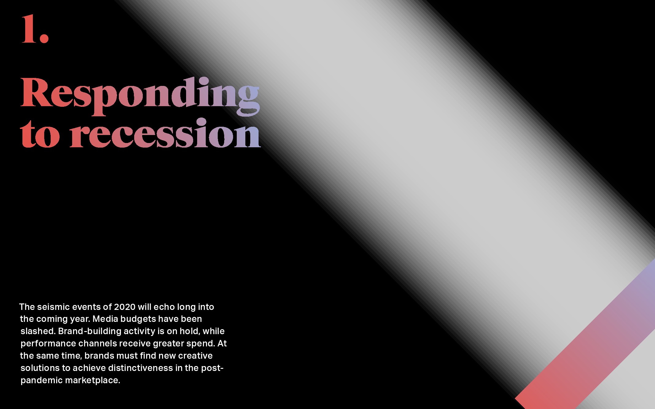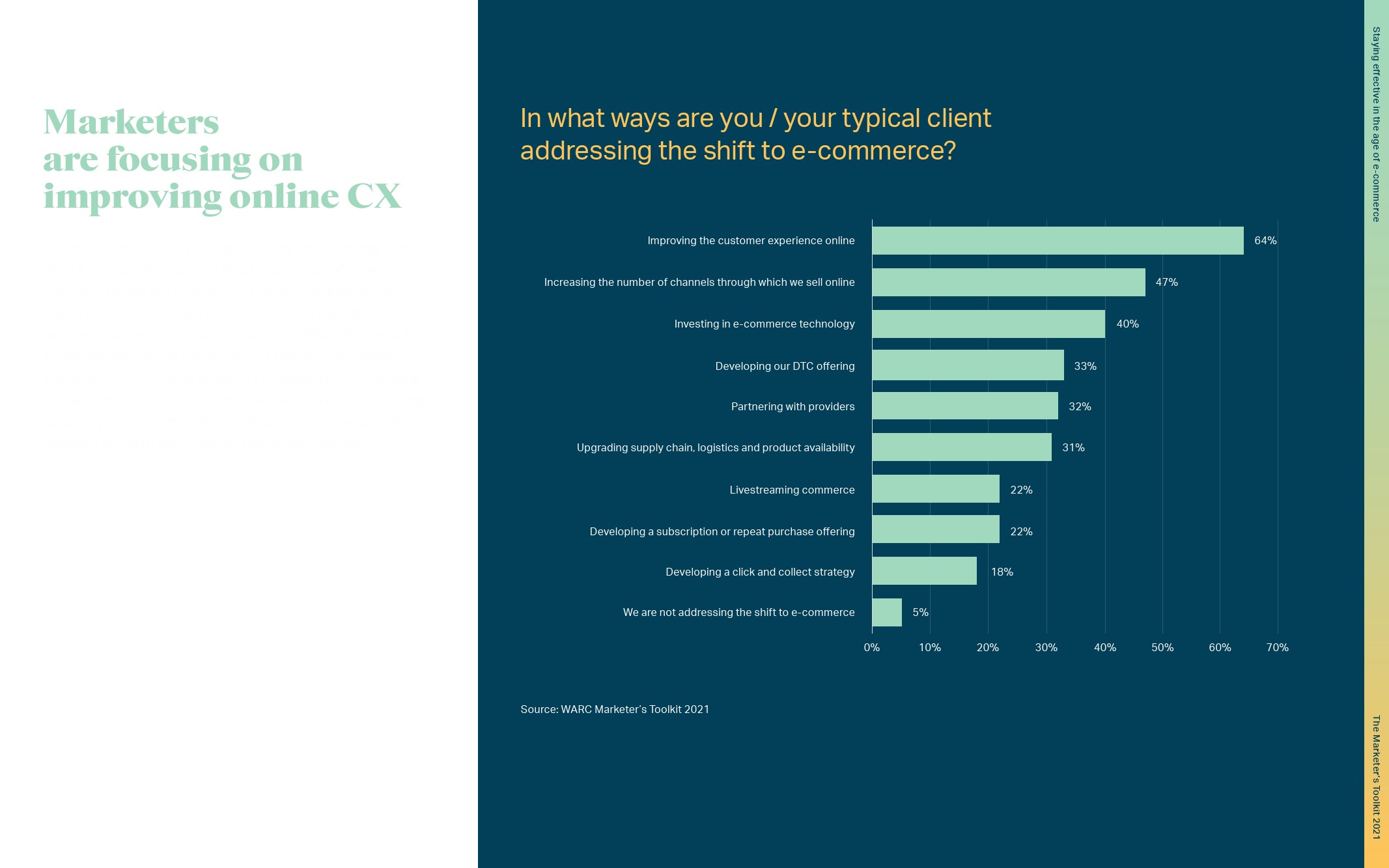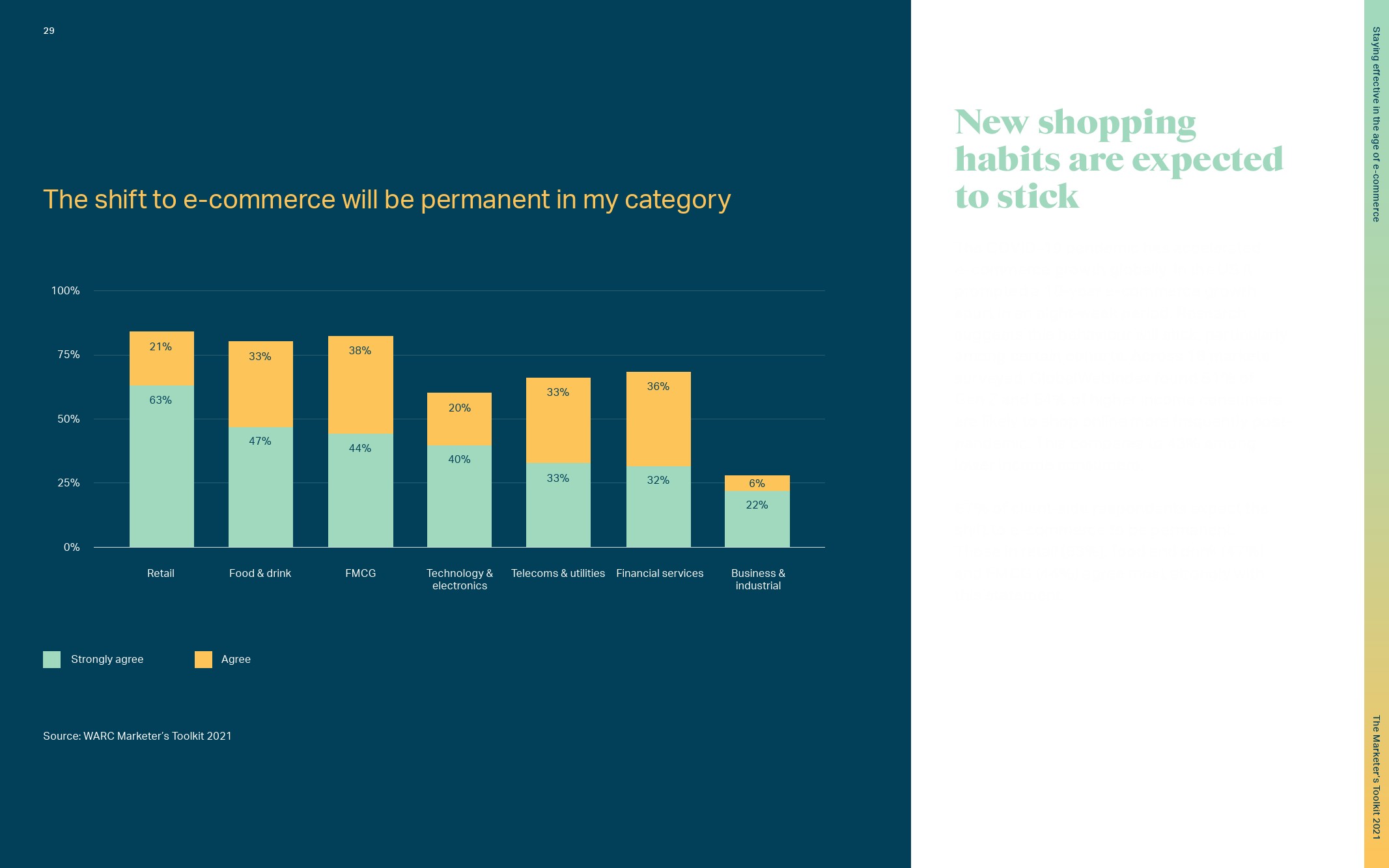 在电子商务时代保持效率。COVID-19大流行在全球范围内加速了电子商务的增长,大多数营销人员认为这种转变是永久的。应对这一趋势是2021年的头等大事。一些企业正在探索直接面向消费者的选择,寻找使消费者更容易重复购买的方法。这种转变将对品牌战略和媒体投资产生连锁反应。
