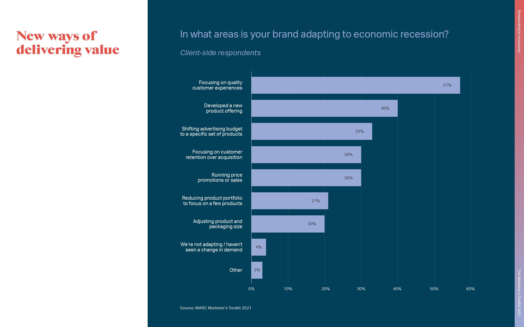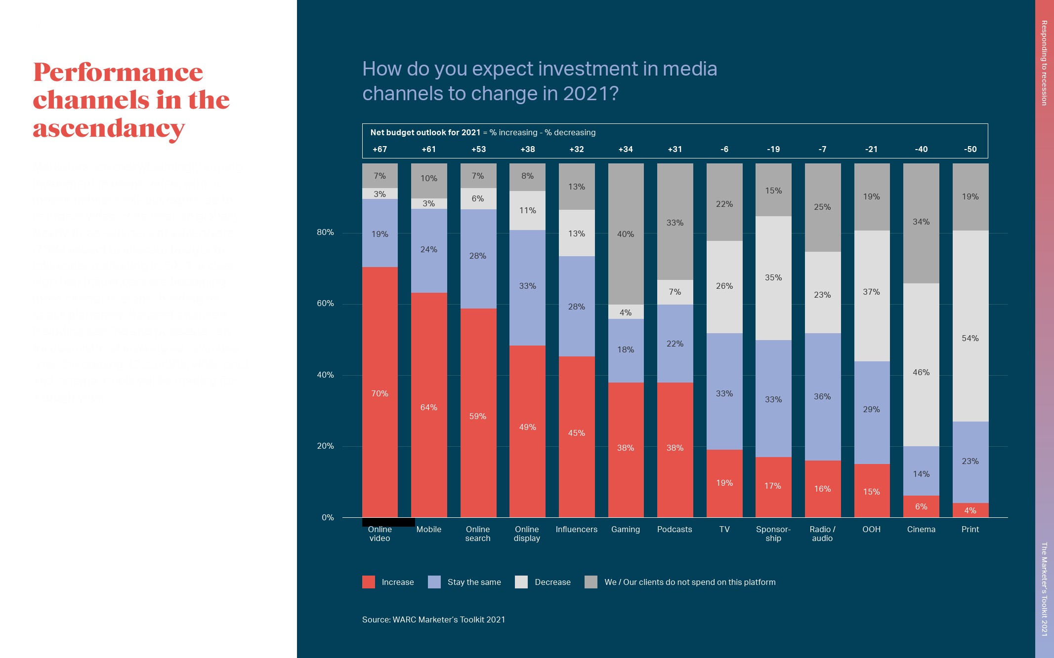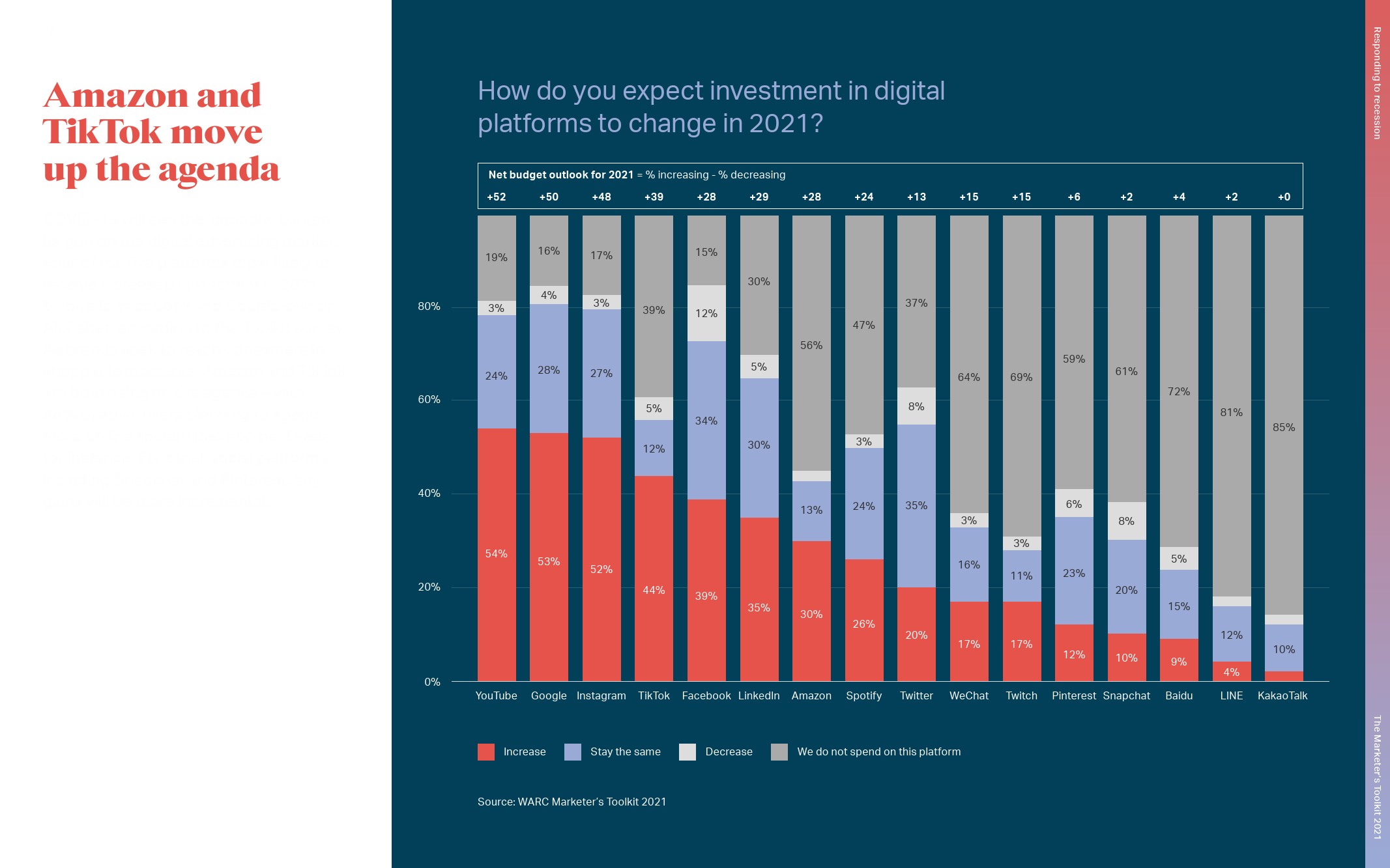 WARC发布了新报告“2021年营销人员工具包”。应对经济衰退,营销人员正在面临艰难的经济环境。品牌投资、代理和供应商费用以及赞助存在压力。绩效营销方面的投资正在发生转变,这反过来加速了数字渠道的趋势,其中亚马逊和TikTok就是增长的典型。