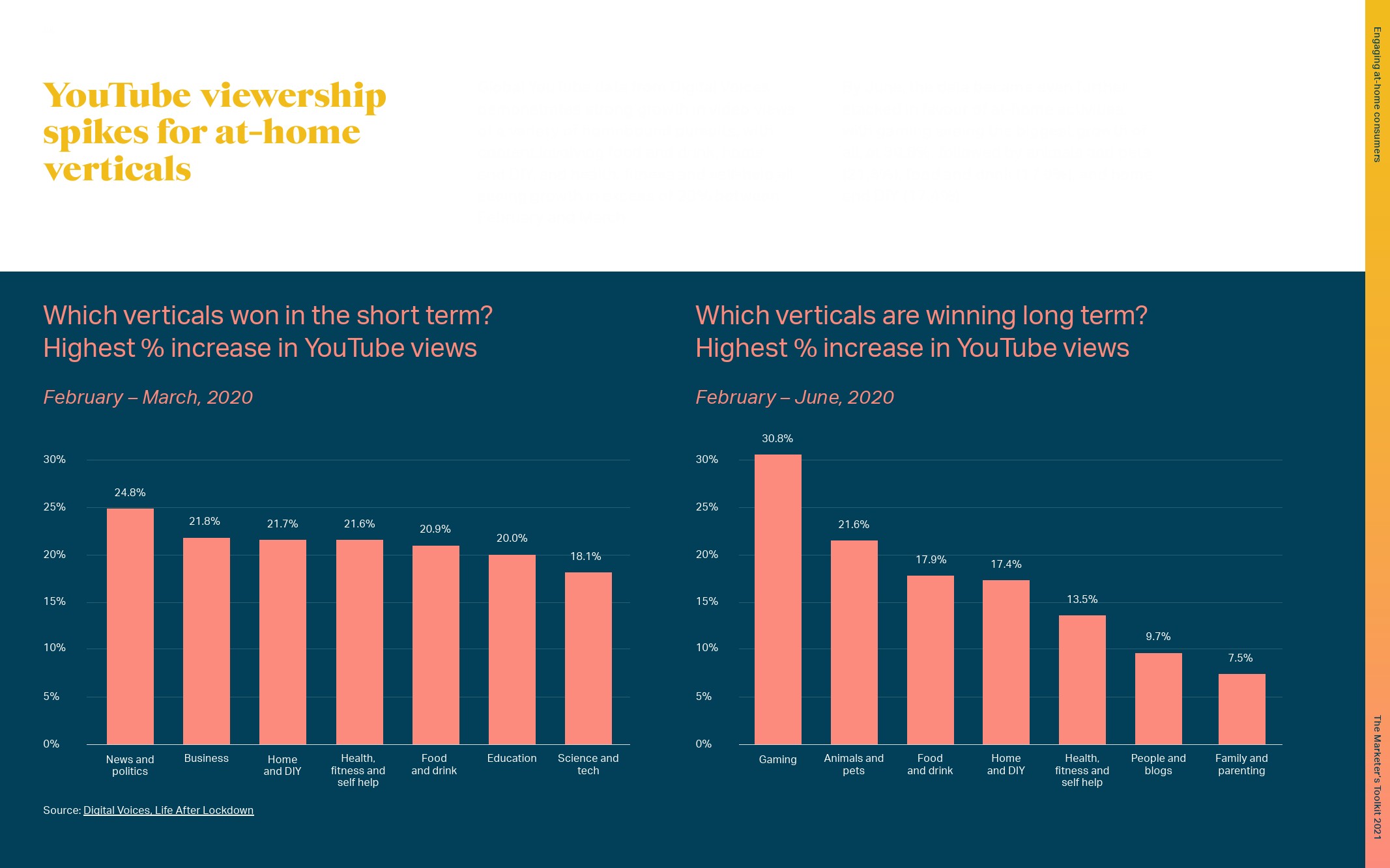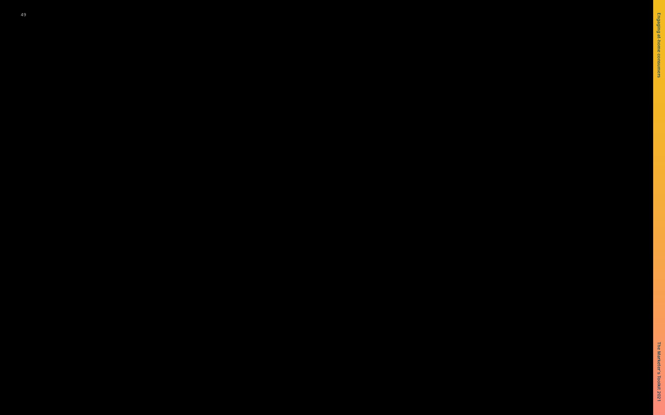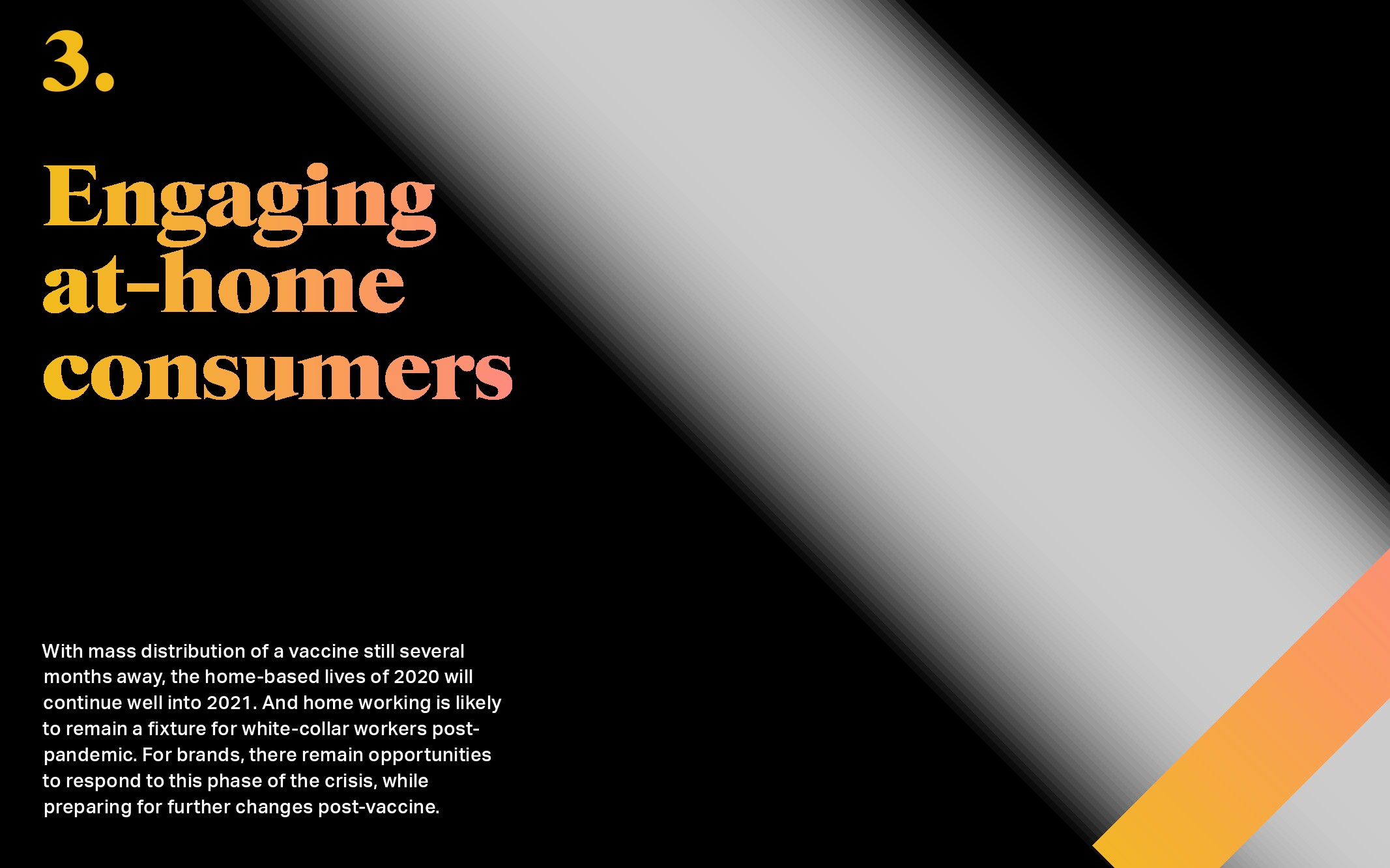 吸引家庭消费者。由于许多主要市场对消费者的限制将持续到2021年,因此“家庭”生活方式将继续推动变革,并可能带来新的机遇。对于品牌来说,这意味着发现在哪里以及如何成为消费者家庭生活中受欢迎的部分很重要。
