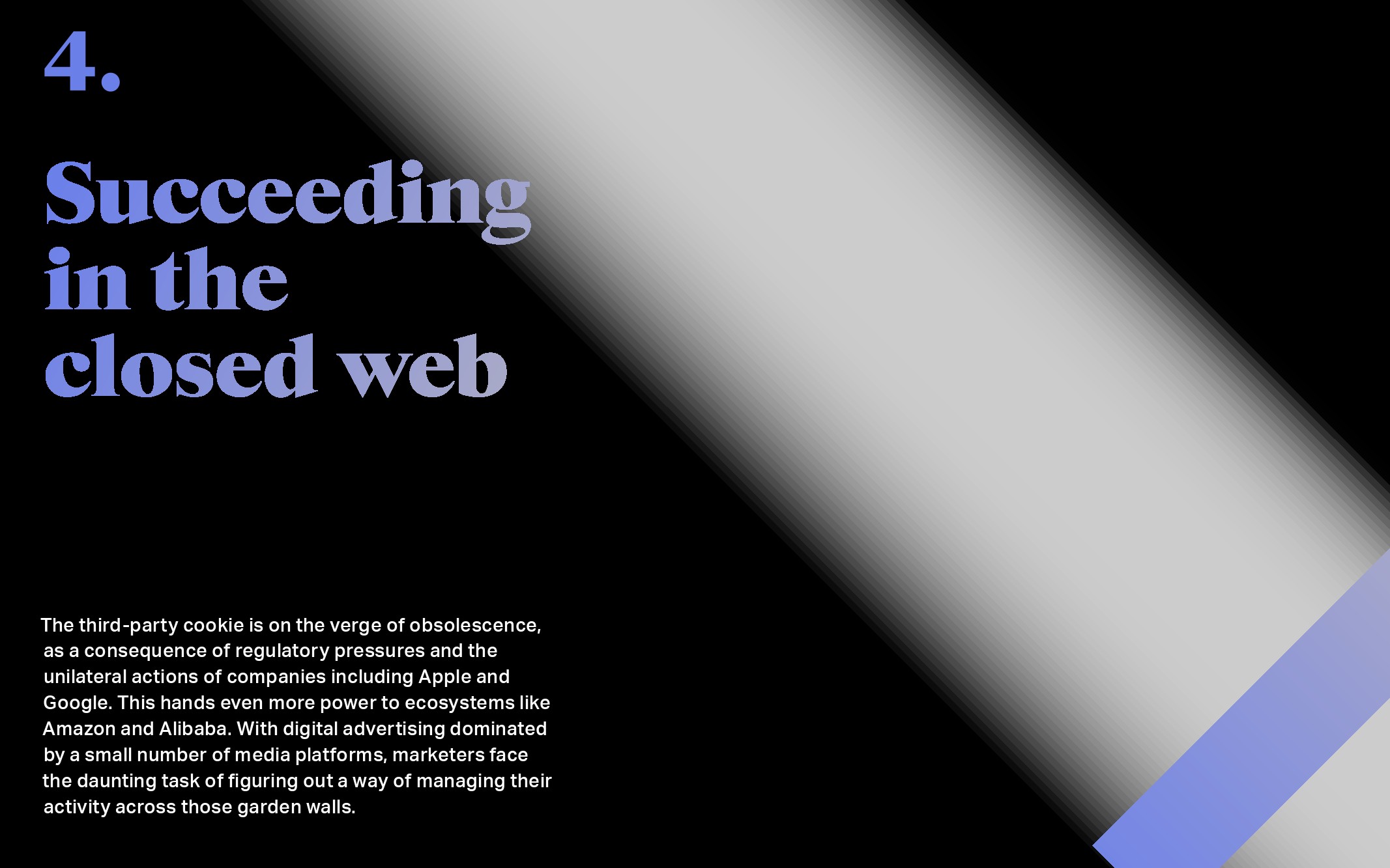 在封闭的网络中获得成功。由于监管压力和包括苹果和谷歌在内的公司的单方面行动,第三方cookie即将过时。这样一来,大型“围墙花园”就拥有了更多的权力。在少数媒体平台主导着数字广告的情况下,营销人员面临着艰巨的任务,即要在这些花园墙之间管理其活动。