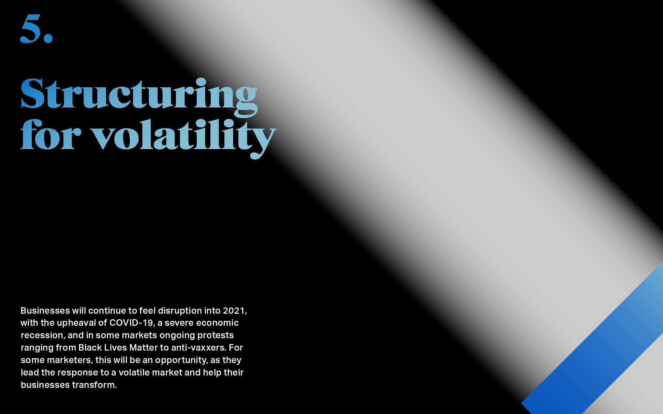 应对市场动荡。企业在2021年之前将继续感到混乱,大多数企业在努力跟上市场潮流的同时,也在进行某种形式的“数字化转型”投资。对于某些营销人员而言,这将是一个机会,因为他们可以帮助企业应对瞬息万变的市场并“更好地重建”。