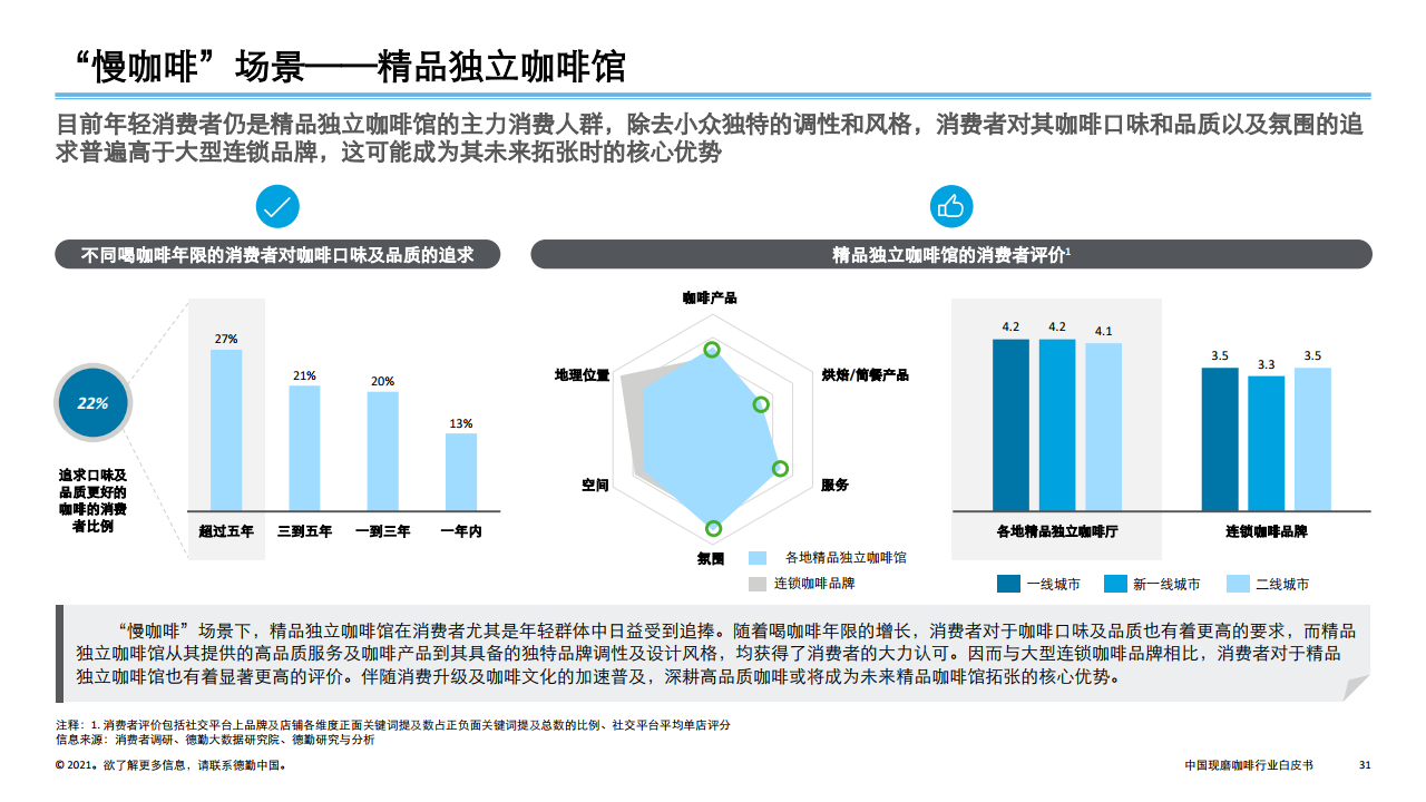 德勤中国及穆棉资本联合发布《中国现磨咖啡行业白皮书》(下称‘白皮书’),从消费需求、竞争格局及商业模式三方面揭示中国现磨咖啡市场现状和前景,同时指出“快咖啡”和“慢咖啡”两大消费场景正推动商业模式的演变,现磨咖啡品牌需掌握关键成功因素以实现增长。